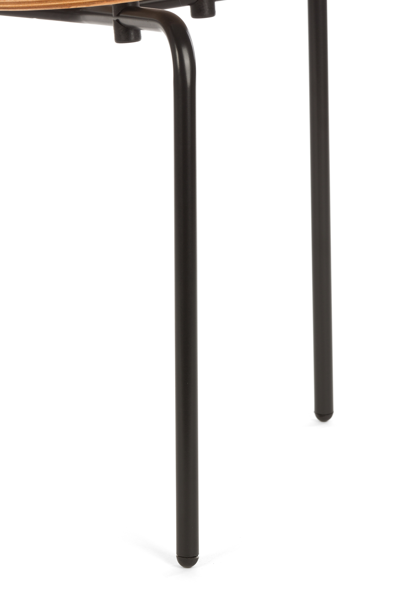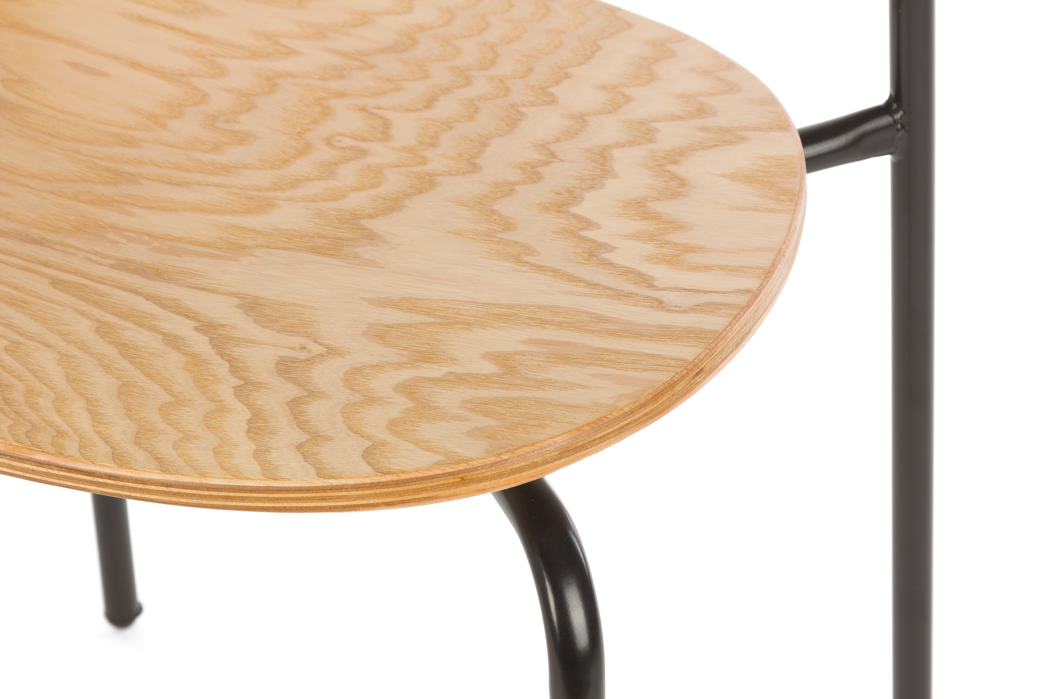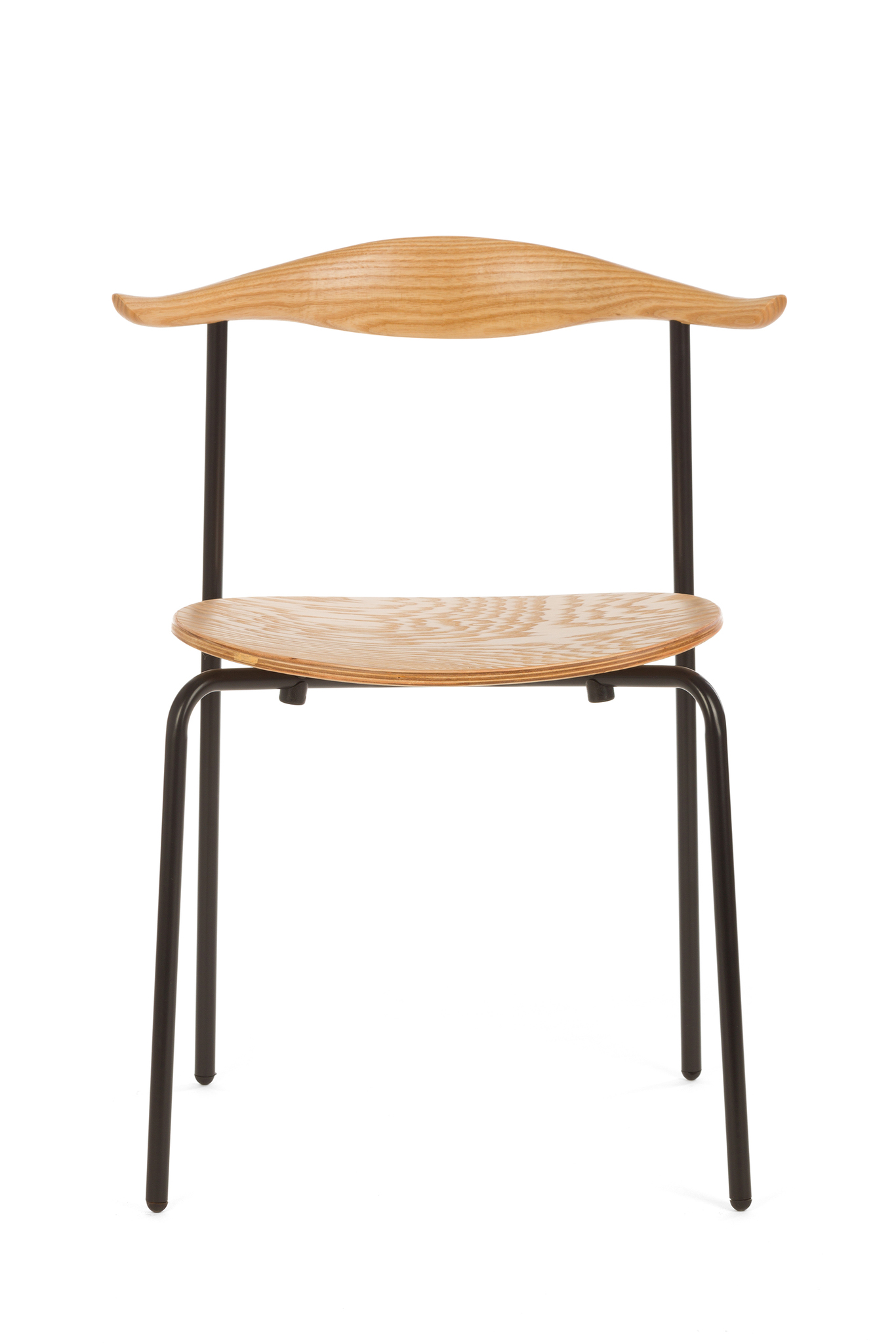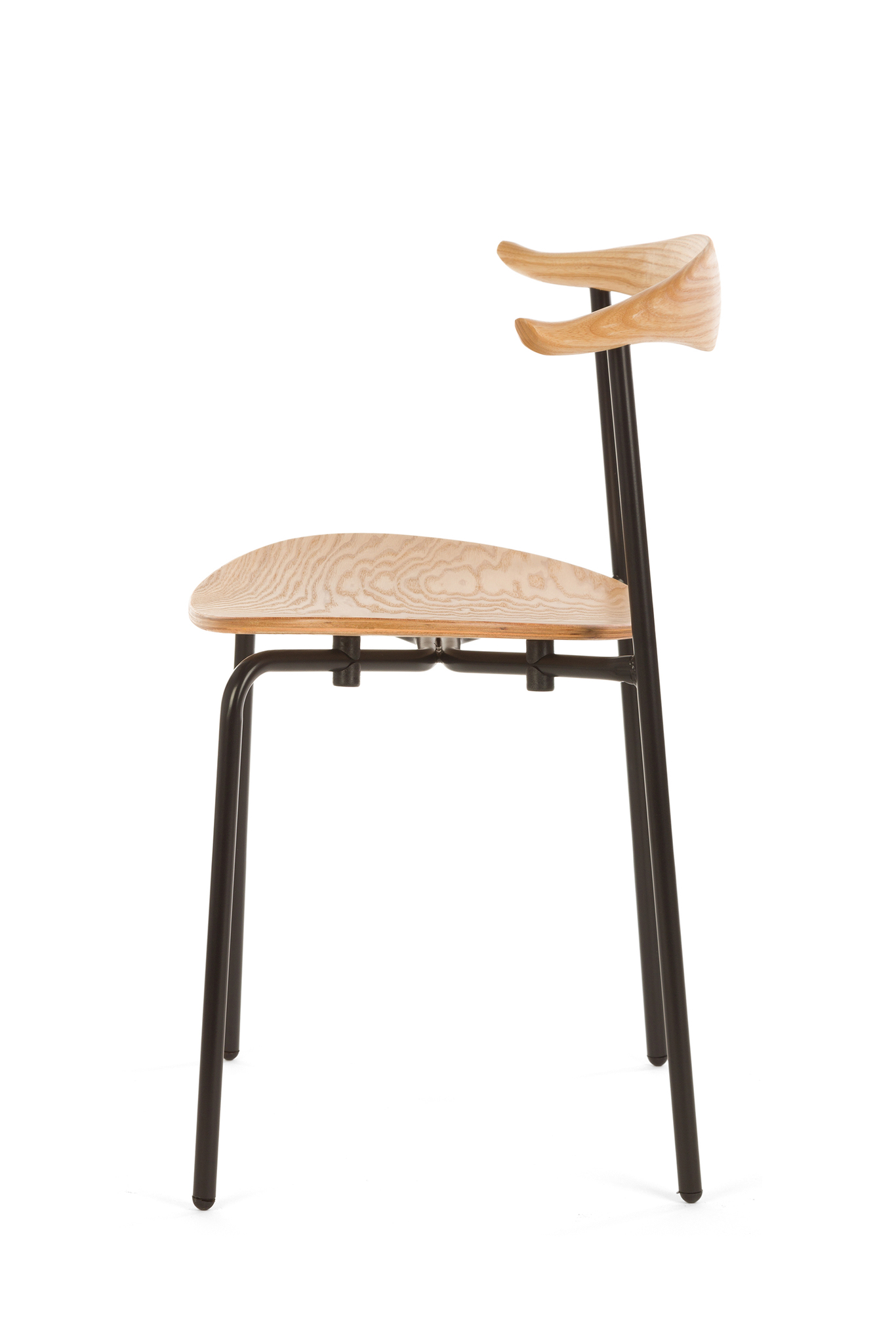 Стул имеет простой и минималистичный стальной каркас черного цвета. Спинка представляет собой изящную фигуру из дерева, отдаленно напоминающую рога.