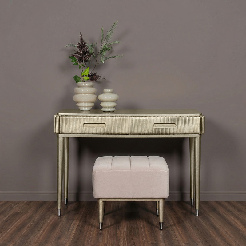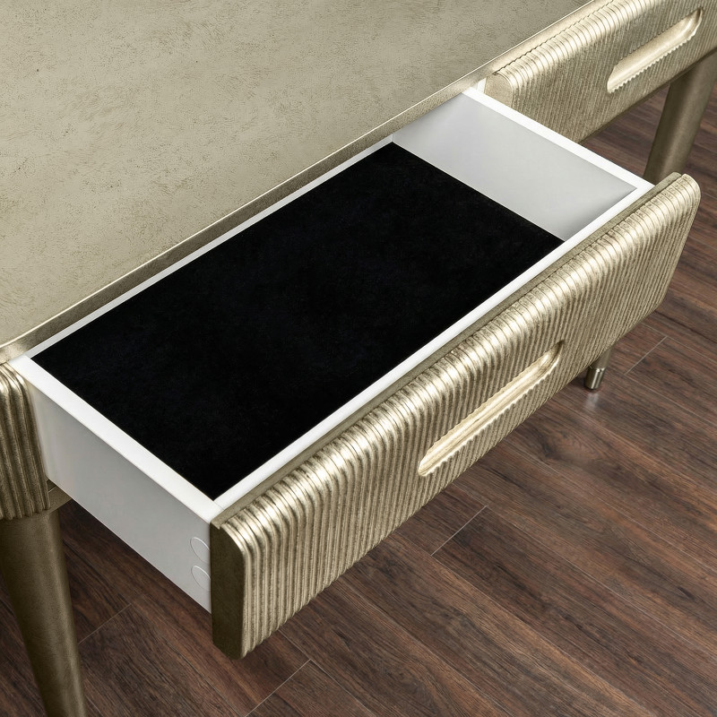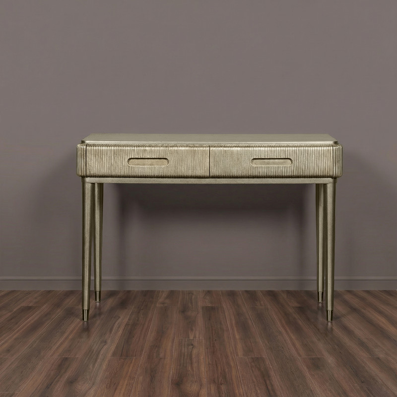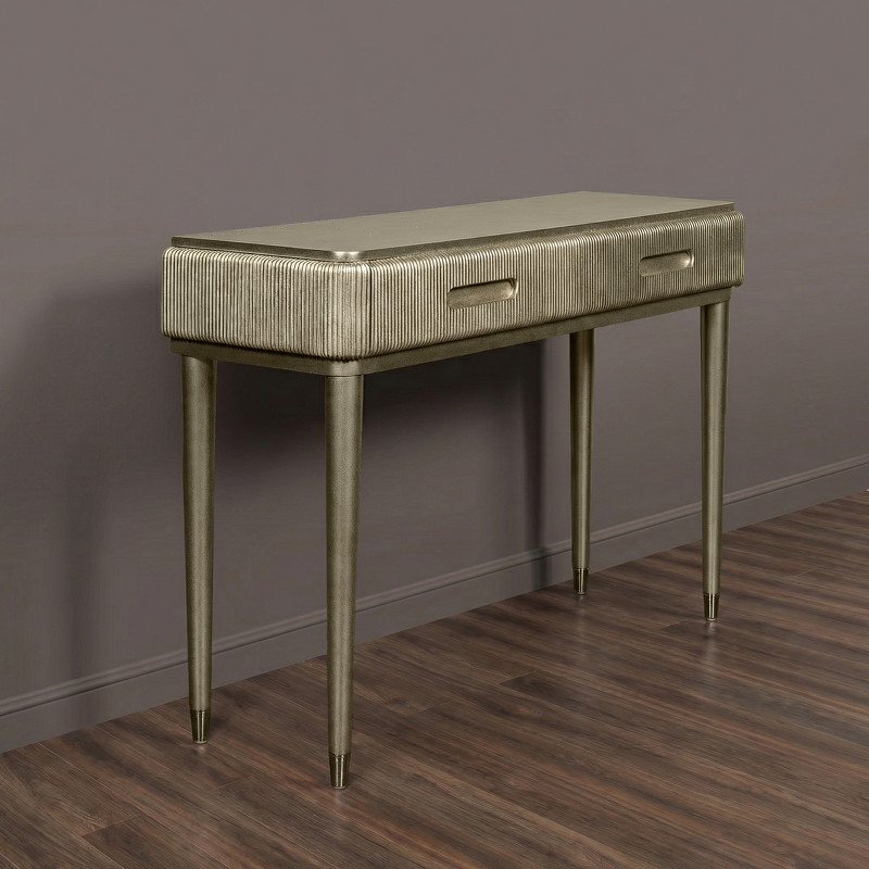 Дизайнерская консоль от итальянского бренда Fratelli Barri. Закругленная форма и рифленые фасады выглядят очень актуально. Ножки прямые круглые, зауженные к низу. На ножках металлические колпачки. У консоли 2 ящика. Ручка - выемка на фасаде. Отделка - лак, цвет - патинированное серебро. Выполнена из массива дерева и высококачественного МДФ класса Е1. Цвет фурнитуры - хром. Ящики оснащены механизмом открывания push-pull. Дно ящиков декорировано черной бархатной тканью. Корпус ящиков - белого цвета. Данный предмет является частью коллекции Rimini. Вы можете оформить гостиную, столовую, спальню, кабинет и другие комнаты Вашего дома в едином стиле.