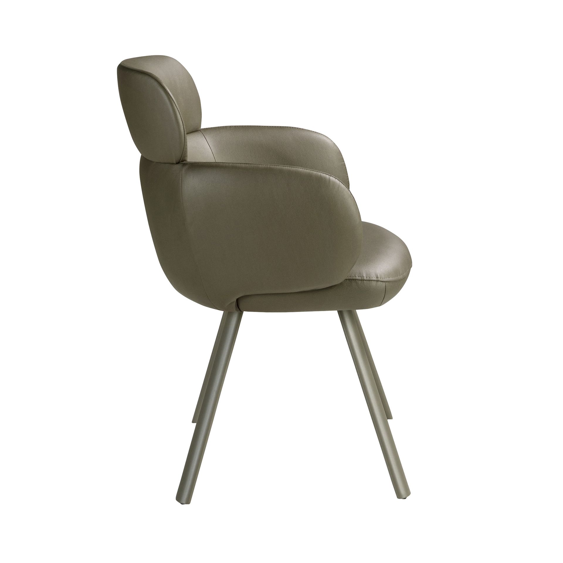 Современный поворотный стул с подлокотниками, сиденье и спинка которого обиты оливково-зеленой искусственной кожей. Ножки из зеленой нержавеющей стали, сочетающие в себе авангардный и вневременной стиль, сделают его незаменимым элементом вашей кухни или столовой. Этот стул от Анхеля Серда сочетает в себе уникальный и индивидуальный стиль бренда с максимальным комфортом и устойчивостью благодаря высокому качеству обивки и оригинальной конструкции ножек.