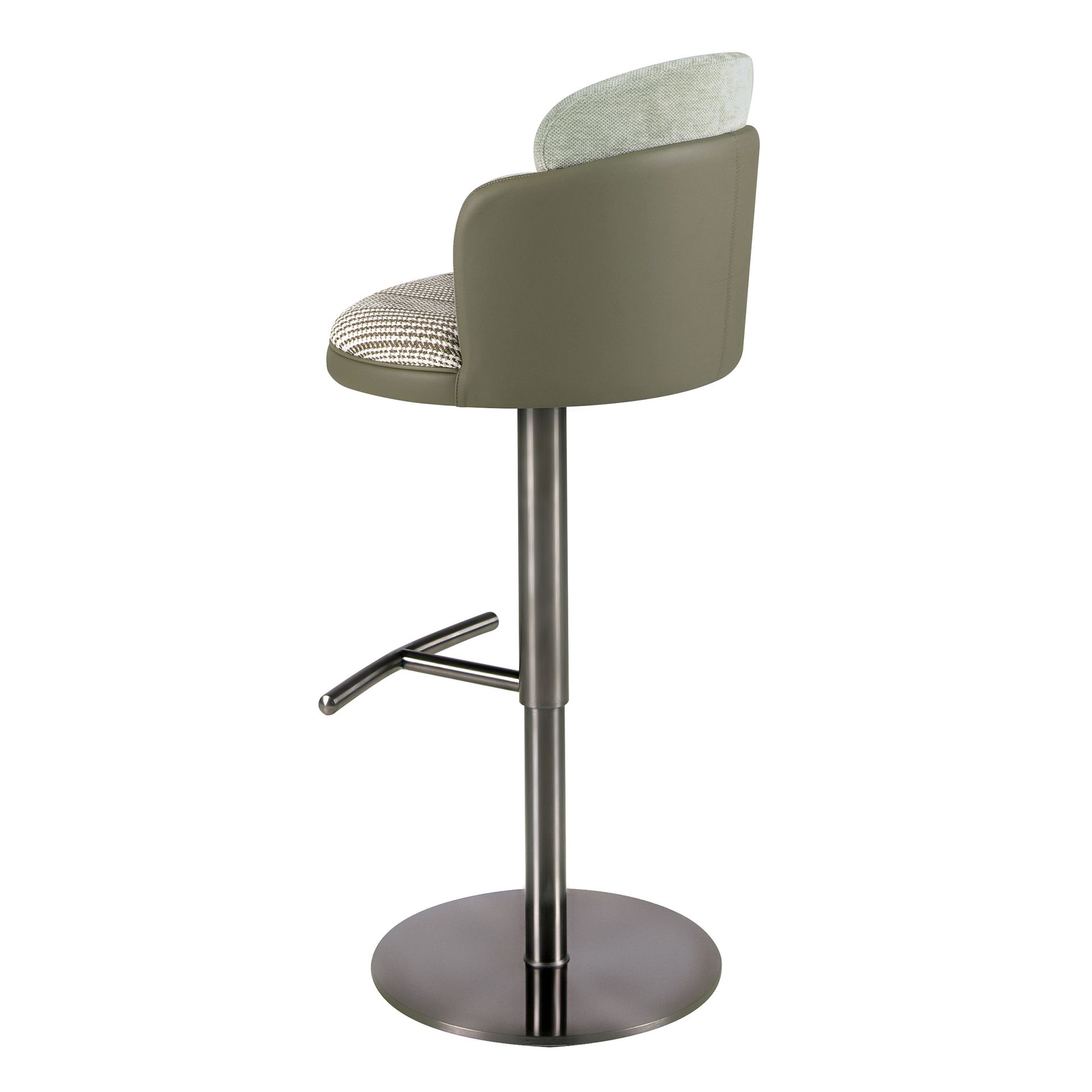 Современный поворотный табурет с сиденьем, обитым темно-зеленой и белой тканью, и спинкой, обитой оливково-зеленой искусственной кожей. Ножки из полированной нержавеющей стали с затемненным дизайном, сочетающие в себе авангардность и вневременную элегантность, сделают его незаменимым элементом вашей кухни или столовой. Этот табурет от Angel Cerdá сочетает в себе уникальный и индивидуальный стиль бренда с максимальным комфортом и устойчивостью благодаря высокому качеству обивки и оригинальной конструкции ножек. Регулируемая по высоте высота сиденья позволяет настроить его под ваши потребности, делая его еще более удобным.