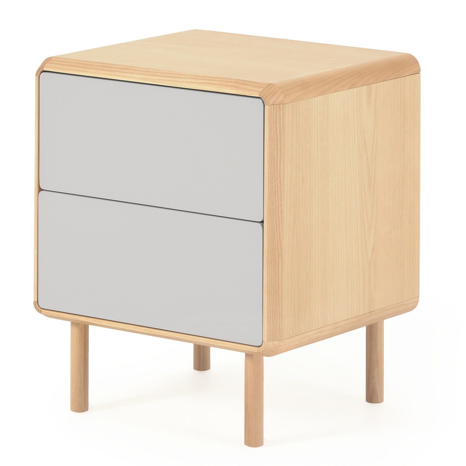 Прикроватная тумба из шпона ясеня с ножками и каркасом из массива ясеня. Ящики с плавным закрыванием, механизмом открывания push-to-open и регулируемыми ножками. Фасад окрашен в серо-белый цвет. Эта модель от La Forma сочетает в себе функциональность и элегантный дизайн, становясь идеальным дополнением вашей спальни.