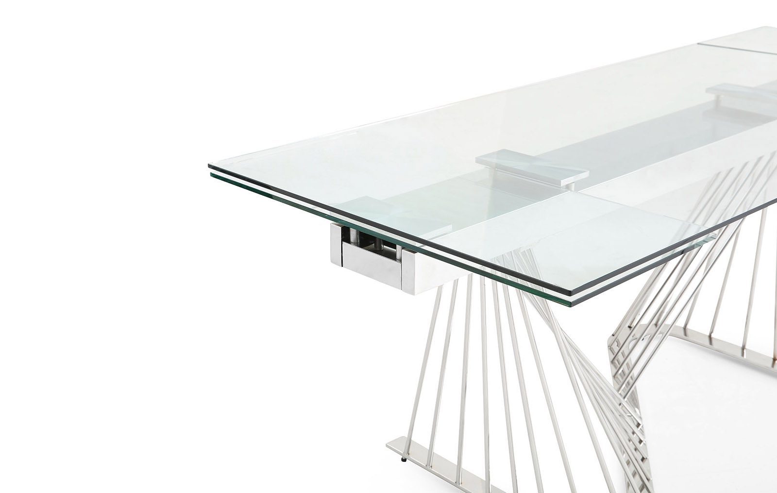 Столешница выполнена из каленого стекла толщиной 10 мм — материала, который сочетает в себе хрупкую эстетику и выдающуюся прочность. Абсолютная прозрачность создает эффект парящей в воздухе ледяной плоскости, которая не перегружает пространство даже при максимальном разложении. Стекло отражает свет, играет бликами и визуально расширяет границы комнаты, делая масштабную конструкцию легкой и почти невесомой. Основание из хромированной стали с зеркальным блеском не только обеспечивает безупречную устойчивость, но и добавляет композиции футуристичный, космический шик. Kron — это стол-трансформер для тех, кто привык собирать большие компании, но не готов жертвовать эстетикой и современным дизайном.