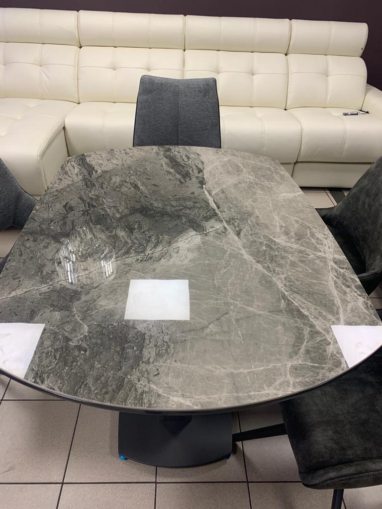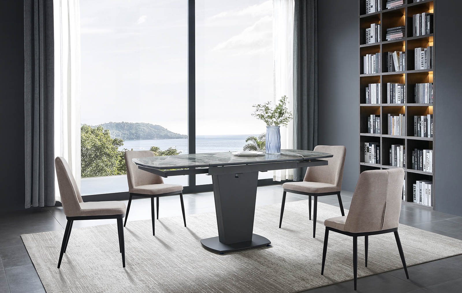 Форма стола трансформируется вместе с размером. В сложенном состоянии это безупречный овал, мягкий и эргономичный, идеально вписывающийся в небольшие пространства. В разложенном виде столешница приобретает благородную прямоугольно-овальную форму — плавные торцы и строгие длинные стороны создают гармоничный, скульптурный силуэт. Столешница выполнена из темно-серой керамики премиум-класса с легкой сатиновой текстурой. Этот глубокий, дымчатый оттенок не выходит из моды, он устойчив к царапинам, термоударам и бытовым загрязнениям, сохраняя безупречный вид десятилетиями. Gunvor — это стол для тех, кто ценит безупречную эстетику, передовые технологии и абсолютную свободу от компромиссов.