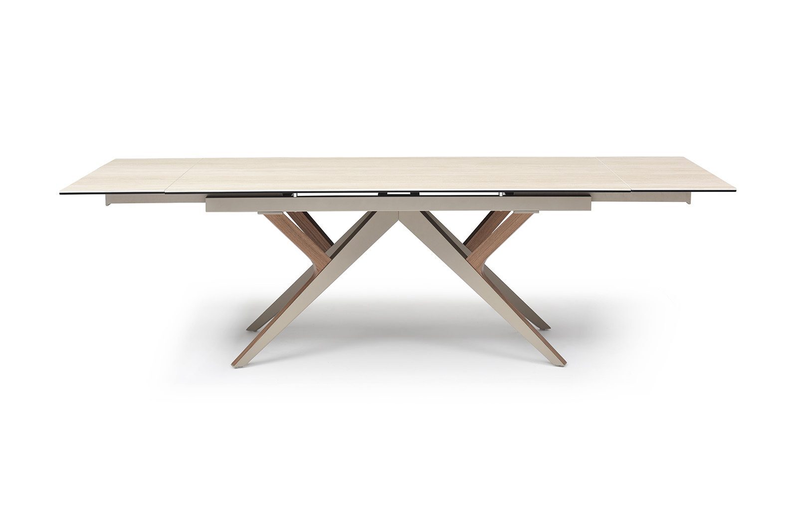 Конструкция стола впечатляет своей надёжностью и продуманностью. Прочная металлическая ножка в современном приглушённом цвете TAUPE (серо-бежевый) сочетается с вставками из массива дерева в натуральном шпоне ореха. Этот акцент добавляет интерьеру столь важное природное тепло и тактильность, гармонично контрастируя с холодным блеском керамики и металла. Стол легко трансформируется благодаря скрытому механизму, увеличиваясь со стандартных 180 см до полноценных 260 см в длину, что позволяет с комфортом разместить от 6 до 12 человек.