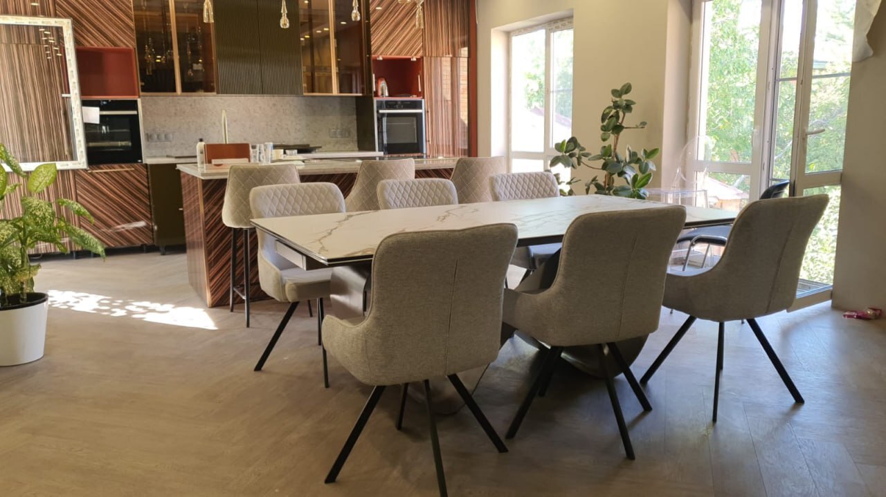 Истинное технологическое чудо стола раскрывается при трансформации. Уникальная система гарантирует, что мраморный узор на раскладных вставках не живёт обособленно, а является бесшовным продолжением рисунка основной столешницы. После раскладывания границы между секциями становятся невидимыми, создавая иллюзию цельной монолитной поверхности из «камня» впечатляющей длины — от солидных 200 см до банкетных 300 см.