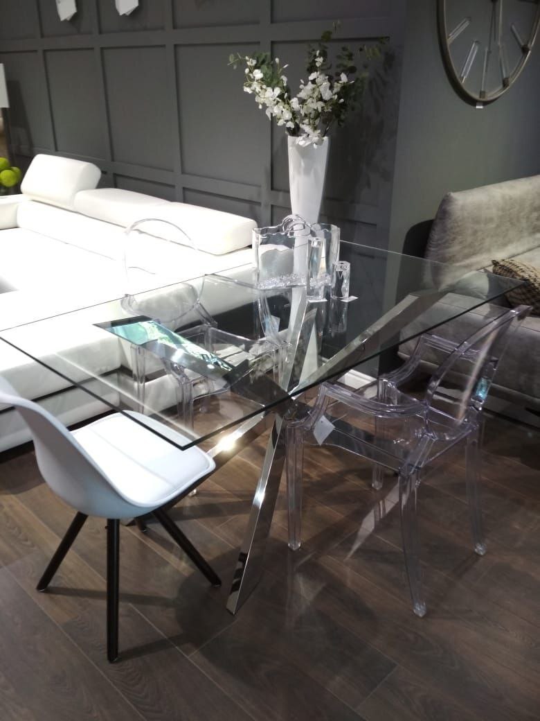 Стол Sofia длиной 180 см — это эффектное решение для тех, кто ценит современную эстетику и ощущение простора. Его ключевая особенность — массивная, но визуально невесомая столешница из сверхпрочного калёного стекла толщиной 12 мм. Такая толщина обеспечивает идеальную жёсткость и безопасность большой площади, создавая впечатление парящей в воздухе зеркальной плоскости. Стол не перегружает пространство, а наоборот, пропускает свет и визуально расширяет границы комнаты, делая её больше и светлее. Стильное хромированное основание с зеркальным блеском добавляет композиции футуристичный лоск, отражая детали интерьера и усиливая световые эффекты.