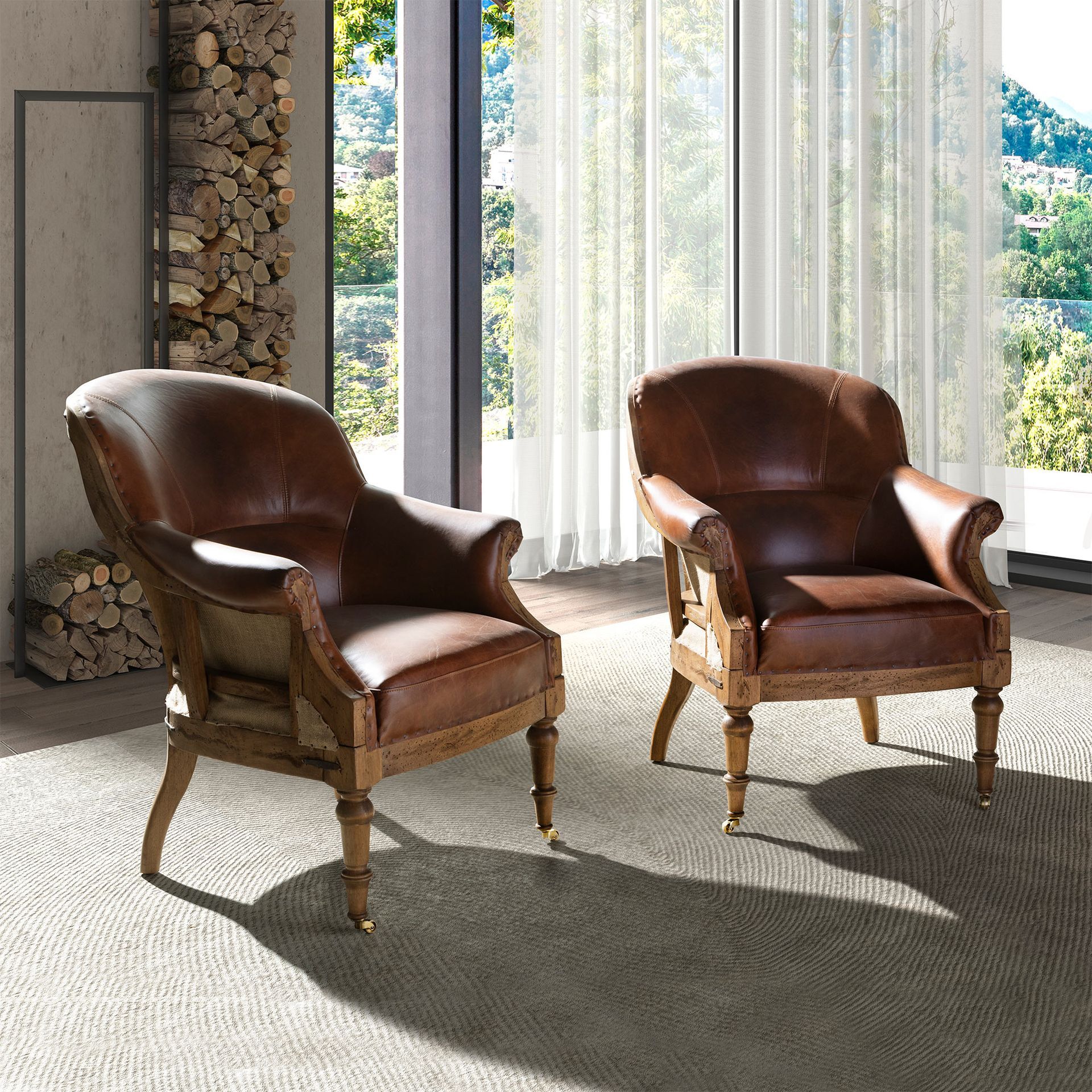 Кресло с подлокотниками современного дизайна, сиденье и спинка обиты воловьей кожей коньячно-коричневого цвета. Как по стилю, так и по ножкам из массива дерева, окрашенным в цвет ореха , это кресло представляет собой идеальное сочетание дизайна и комфорта.