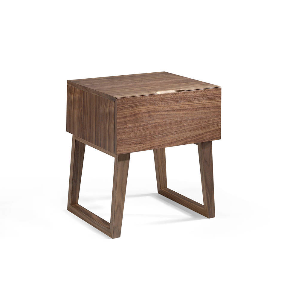 Прикроватная тумбочка CP 1702 -H — обязательный предмет интерьера для уюта в спальне от фабрики Angel Cerda. Тумбочка привлекает внимание своим нетипичным дизайном. Высокие ноги уж точно не ожидаешь увидеть в таком предмете интерьера. Поэтому для современного и стильного оформления спальной комнаты такой набор тумбочек безусловно подойдет лучшим образом. А универсальный древесный цвет позволит не менять ранее созданный интерьер. Тумбочка имеет традиционную прямоугольную форму. Передний фасад — это выдвижной ящик, у которого отсутствует ручка. Вместо нее дизайнеры сделали углубление вверху изделия. Ящик с доводчиком. Материал изготовления тумбочки — МДФ покрытый шпоном орехового дерева. Этот материал прочный и долговечный, эстетически привлекательный и современный. Ноги имеют рамочную конструкцию и образуют с основанием тумбочки тупой угол. Такое конструкционное решение смотрится оригинально и гарантирует изделию хорошую устойчивость, так как увеличивает площадь опоры. Тумбочка имеет следующие размеры: ширина — 45 см, высота — 40 см, глубина — 50 см. К комплекту прикроватных тумбочек можно приобрести из этой же коллекции буфет, женский столик, комод. Все изделия выдержаны в едином стиле, что, безусловно, создаст более полный интерьер.