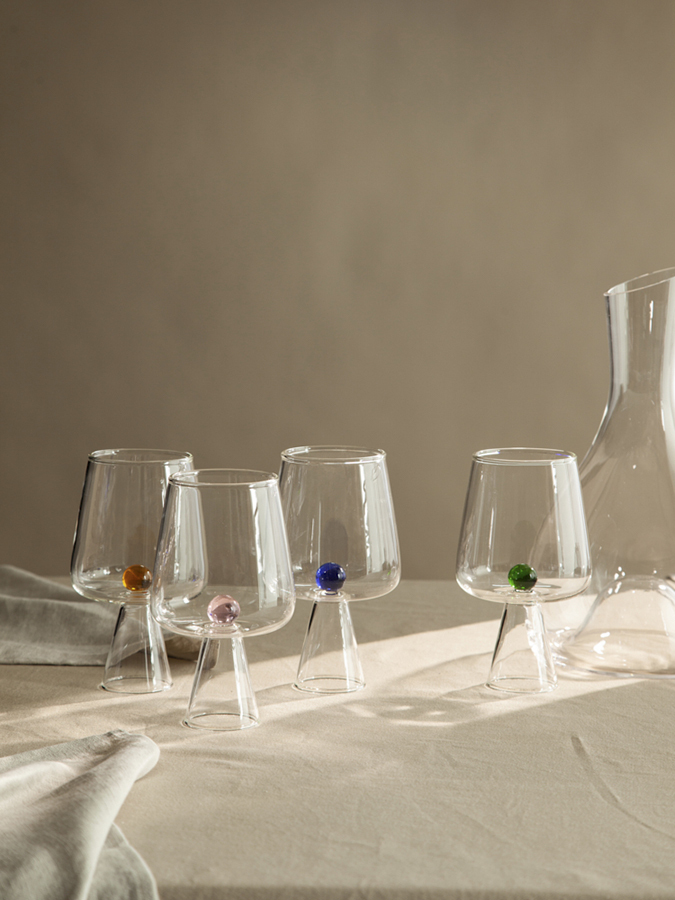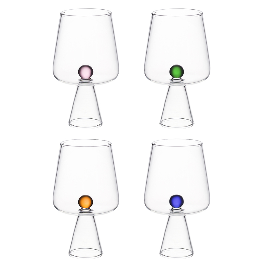 Бокалы для вина Orb – прекрасный способ сделать сервировку особенной. Дизайн с яркими акцентами в виде цветных шариков привлекает внимание и эффектно выделяет предметы из данной коллекции на фоне других. Особенности и преимущества: - Боросиликатное стекло, из которого выполнены бокалы, обладает повышенной прочностью и термостойкостью. - Материал легко очищается от загрязнений и не содержит в своем составе вредных соединений. - Декор в виде цветных шариков делает дизайн уникальным и узнаваемым. Материал: боросиликатное стекло. Диаметр верха: 7,1 см. Диаметр середины: 9 см. Диаметр низа: 4,7 см. Высота: 15,7 см. Высота ножки: 6 см. Вес: 520 г. Толщина стенки: 0,2 см. Объем: 400 мл. Цвет: разноцветный. Количество бокалов в наборе: 4 шт. Бокалы рекомендуется мыть вручную в теплой мыльной воде с помощью мягкой губки. Запрещается использование абразивных материалов и агрессивной бытовой химии.