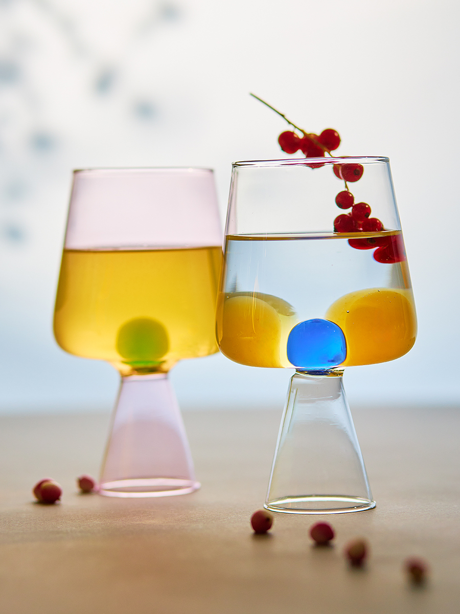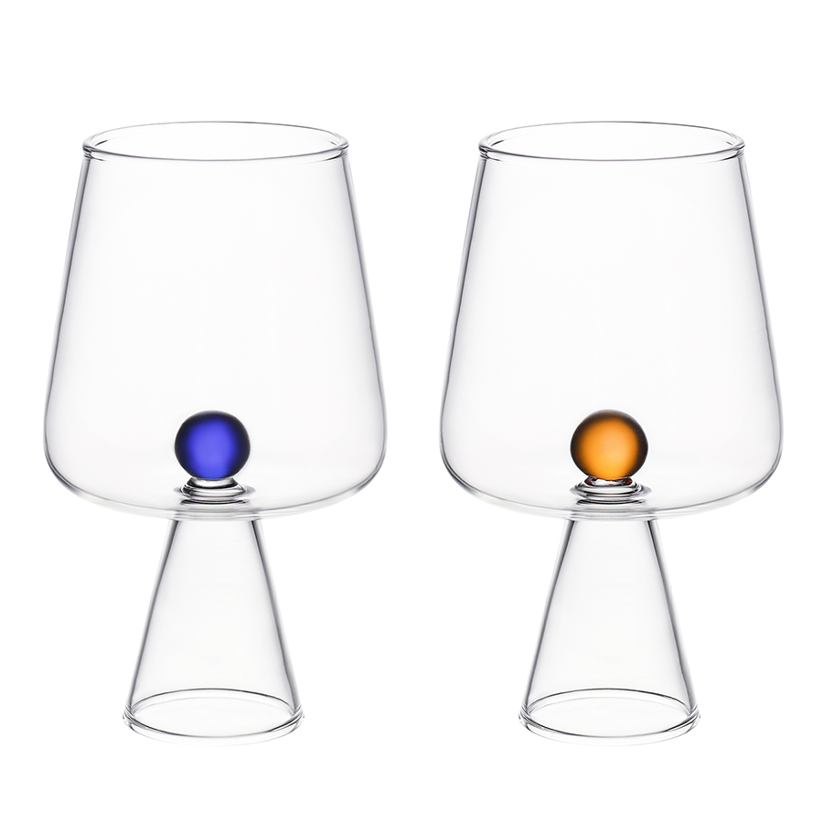 Бокалы для вина Orb – прекрасный способ сделать сервировку особенной. Дизайн с яркими акцентами в виде цветных шариков привлекает внимание и эффектно выделяет предметы из данной коллекции на фоне других. Особенности и преимущества: - Боросиликатное стекло, из которого выполнены бокалы, обладает повышенной прочностью и термостойкостью. - Материал легко очищается от загрязнений и не содержит в своем составе вредных соединений. - Декор в виде цветных шариков делает дизайн уникальным и узнаваемым. Материал: боросиликатное стекло. Диаметр верха: 7,1 см. Диаметр середины: 9 см. Диаметр низа: 4,7 см. Высота: 15,7 см. Высота ножки: 6 см. Вес: 255 г. Толщина стенки: 0,2 см. Объем: 400 мл. Цвет: синий/янтарный. Количество бокалов в наборе: 2 шт. Бокалы рекомендуется мыть вручную в теплой мыльной воде с помощью мягкой губки. Запрещается использование абразивных материалов и агрессивной бытовой химии.