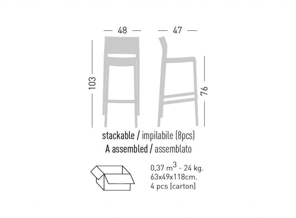 ДизайнEurolinea. Естественное расширение коллекции, с абсолютно пропорциональными строгими и динамическими формами, барные стулья Bakhita идеально подходит для современного образа жизни, а также формальной обстановки общественных пространств. Доступный в двух разных высотах благодаря своей легкости и простой штабелируемости, он чрезвычайно многофункциональный. Материалы и дизайн делают его прочным и долговечным, а также подходят для использования на открытом воздухе. Барные стулья из пластикаBakhita прекрасно подойдут для обстановки кафе, баров, ресторанов, офисов, различных учреждений, залов ожидания и даже частных интерьеров. Особенности: Стулвыполнен с помощью одновременной инъекции металл-полимера. Возможные цвета указаны в палитре на сайте.Подробнее ознакомиться с палитройфабрикиGaber. Штабелируемый (по 8 шт.). Предназначен для использования в помещении и на открытом воздухе. Изделие протестировано CATAS. Сертификат CATAS. Открыть технические характеристики. Инструкция по уходу. Для уточнения всех возможных вариантов материала и цвета данного изделия обращайтесь к нашим менеджерам.