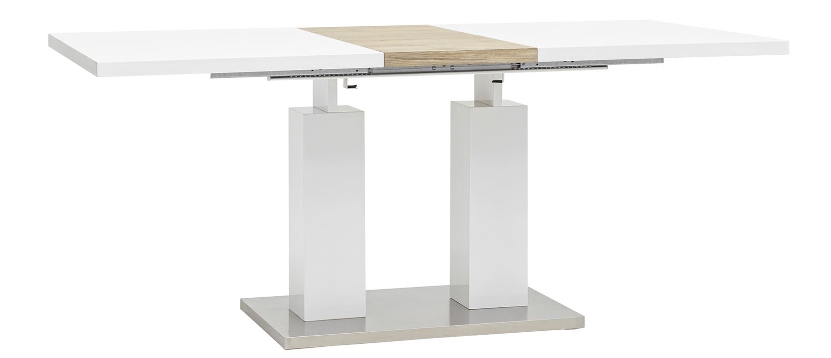 Обеденный стол "Sidney" - это стильное решение для современных кухонь, столовых и ресторанов. Столешница изготовлена из высококачественного МДФ, что обеспечивает ее долгий срок службы и устойчивость к повреждениям. Гладкая глянцево-белая поверхность идеально подходит как для домашнего использования, так и для коммерческих помещений. Металлические ножки придают изделию элегантность и дополнительную стабильность. Форма стола позволяет ему органично вписываться в любой интерьер. Дополнительная откидная часть выполнена из МДФ со шпоном под цвет белого дуба, а также оснащена удобным механизмом открывания одной рукой. Это делает использование такого стола максимально практичным и приятным.