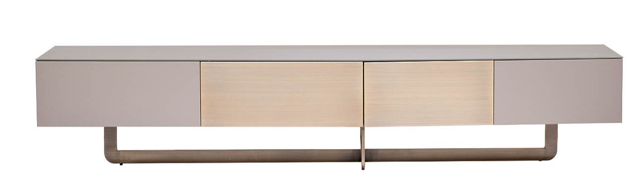 Cуперсовременная тумба под телевизор из мебельной коллекции Space от бельгийского дизайнера Тома Де Вульфа воплощает последние тенденции европейской интерьерной моды. Столешница покрыта закаленным 5мм стеклом. Серый лакированный фасад выполнен из высококачественного МДФ и отделан стальными панелями цвета матовая медь. В тумбе имеется четыре вместительных отделения с выдвижными ящиками. Тумба подходит для установки телевизоров практически любой диагонали. Оригинальная фигурная опора заменяет традиционные ножки, обеспечивая устойчивость и безопасность конструкции даже при полной загрузке полок. Все части тумбы выполнены из исключительно качественных материалов по самым современным технологиям.