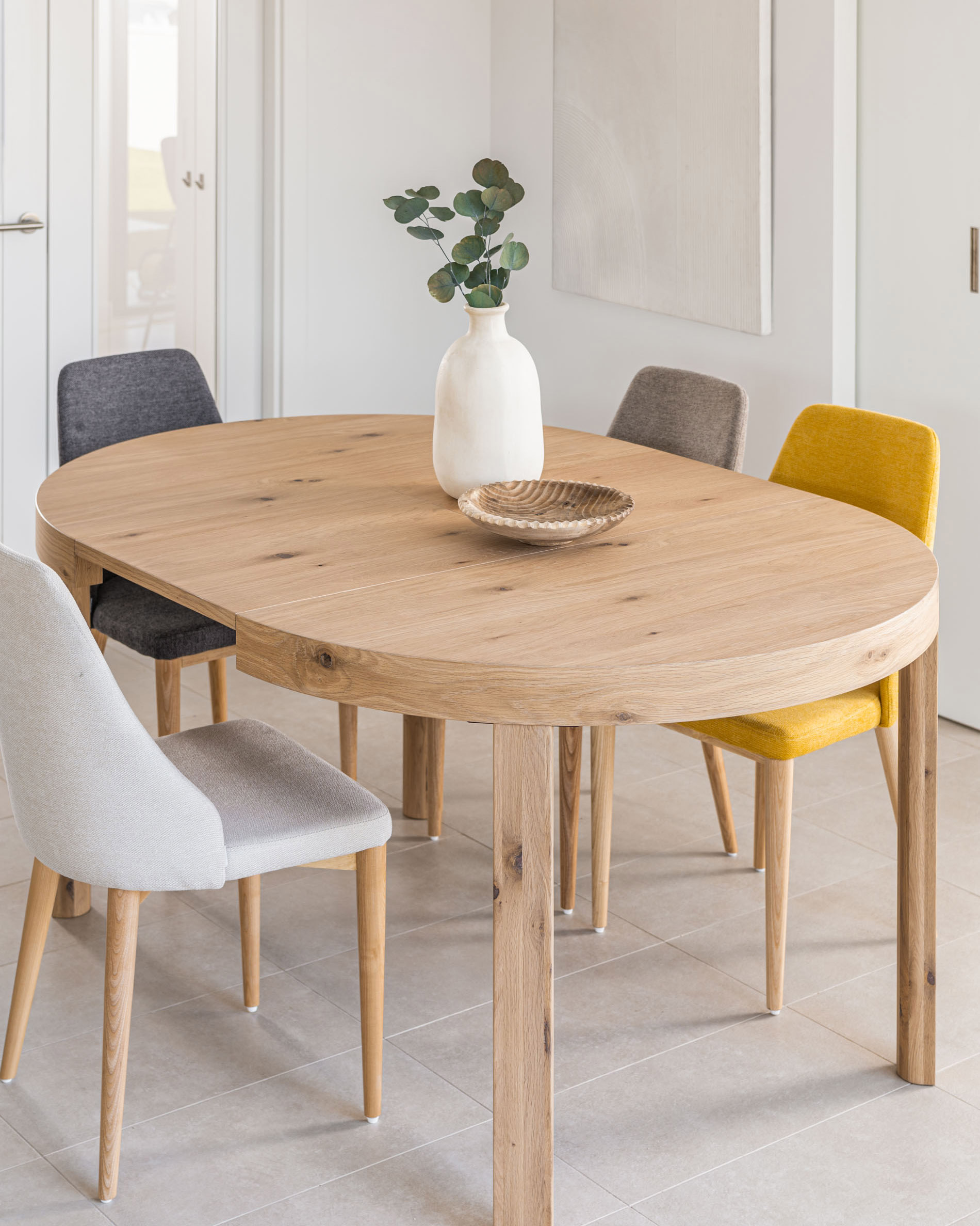 Раздвижной круглый стол. Столешница из шпона дуба и ножки из цельного дерева с регулируемыми ножками для обеспечения устойчивости. Изготовленный из массива дерева, уникальный рисунок тонов и зернистости делает каждое изделие эксклюзивным и неповторимым. Во избежание повреждения поверхности столешницы рекомендуется использовать скатерти или салфетки.