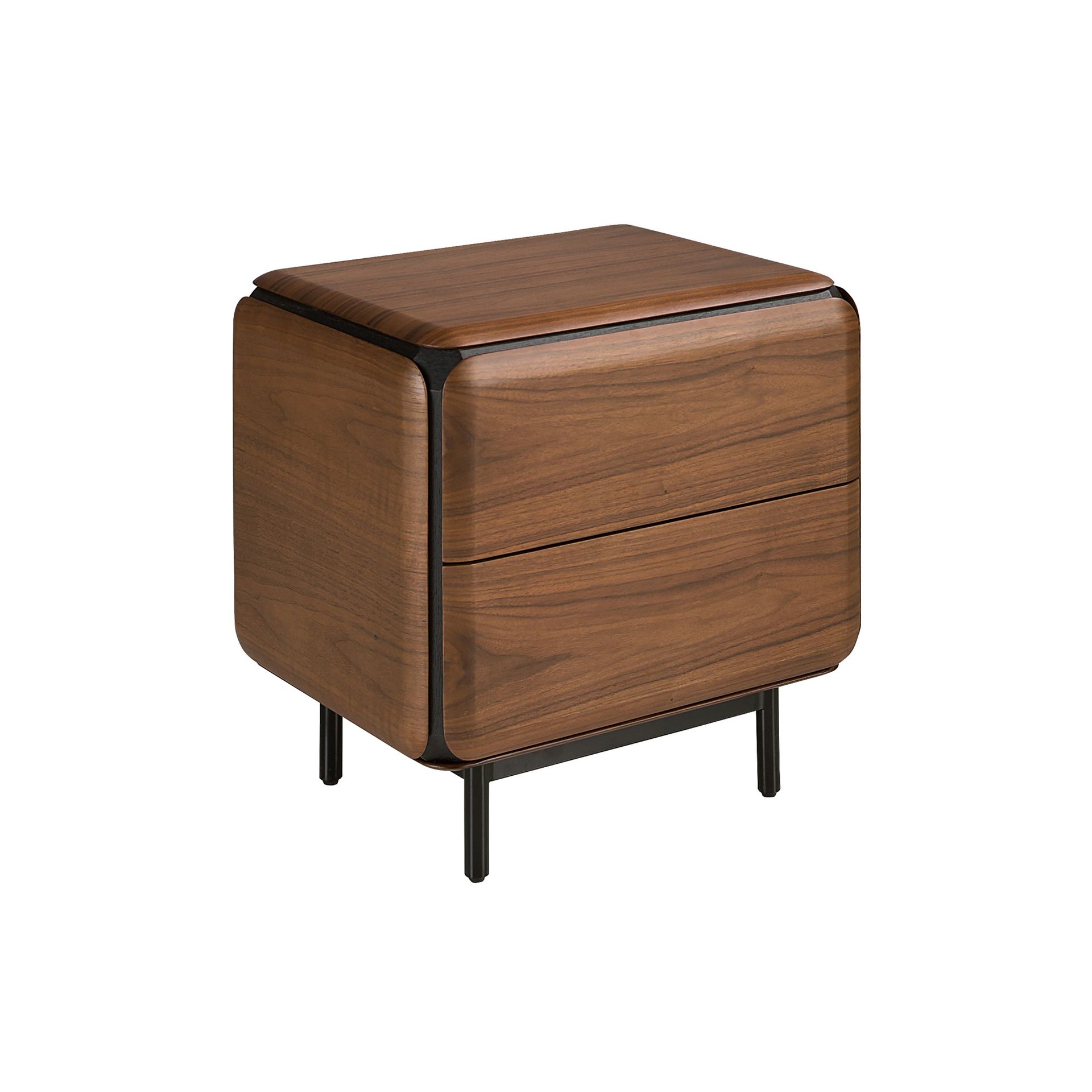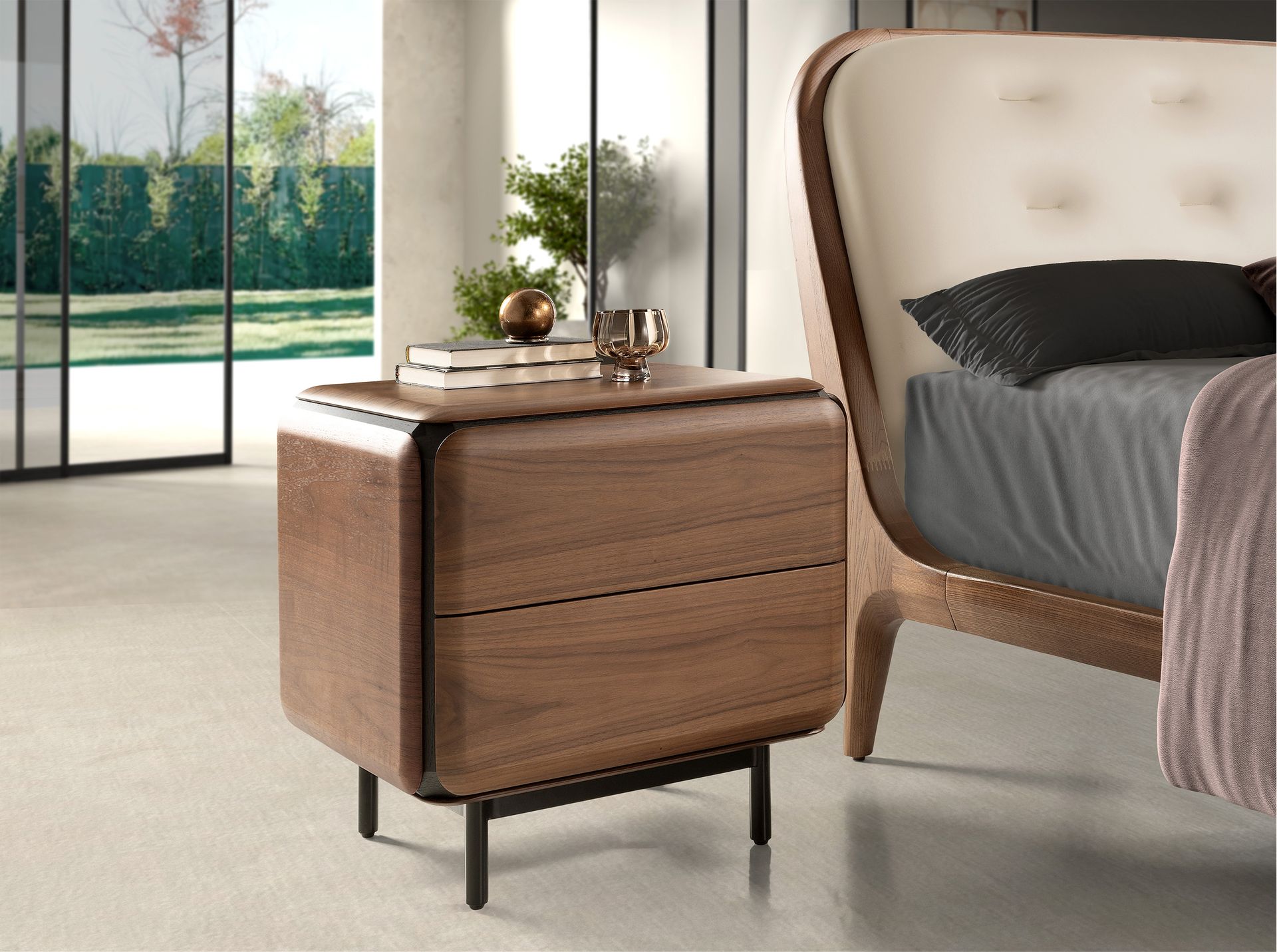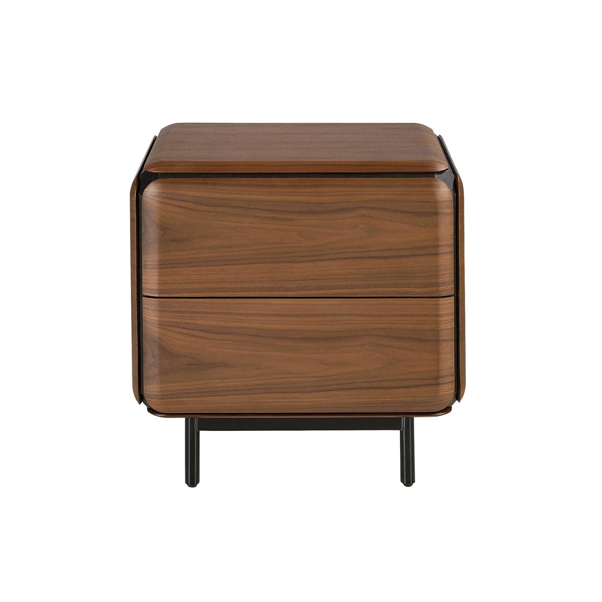 Современная прикроватная тумба из натурального орехового шпона с каркасом из древесины цвета венге и оригинальными ножками из черной нержавеющей стали. Она имеет вместительные ящики с 2 выдвижными ящиками, открывающимися и закрывающимися вручную.