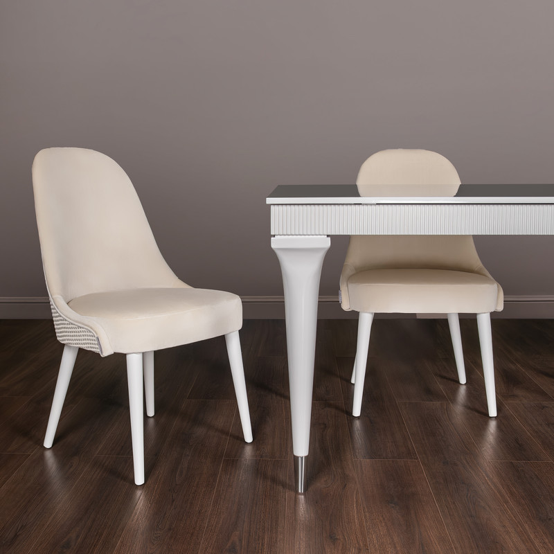 Стул от фабрики Fratelli Barri выполнен в современном стиле. Ножки выполнены из массива бука в отделке белый глянцевый лак. Материал обивки: ткань сидения и внутренней спинки Paddington 27, ткань внешней спинки Rich 14. Коллекция ткани Paddington состоит из модифицированного полиэстера, что позволяет волокнам пропускать свет и создавать перламутровый эффект, напоминающий натуральный жемчуг. Ткань износостойкая и долговечная за счет плотного ворса. Тип ткани: микровелюр. Состав: 100% полиэстер. Наполнение: ППУ повышенной износостойкости.