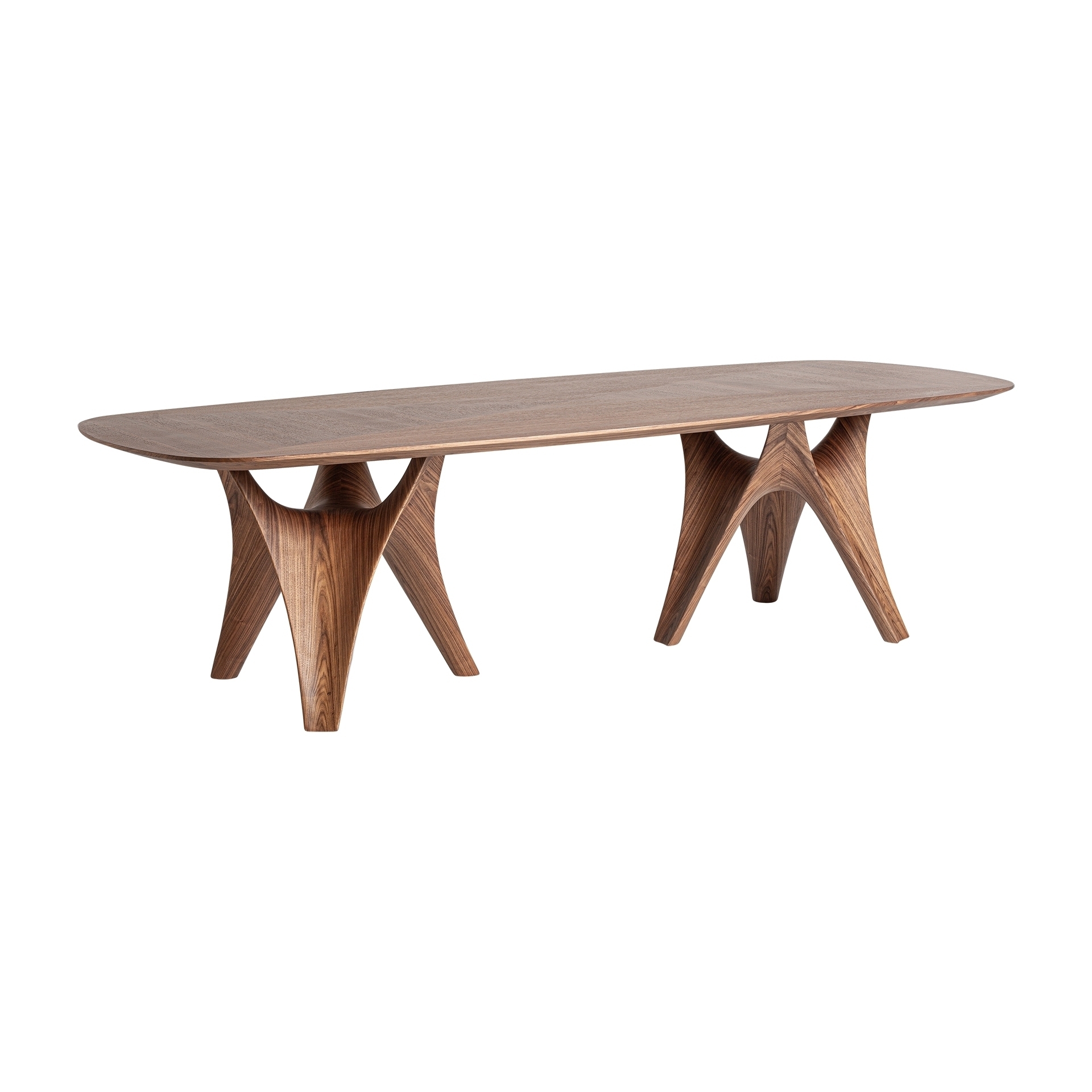Обеденный стол Bilzen в современном стиле, изготовлен из шпона коричневого ореха с натуральной отделкой в сочетании с DM древесиной и стекловолокном.