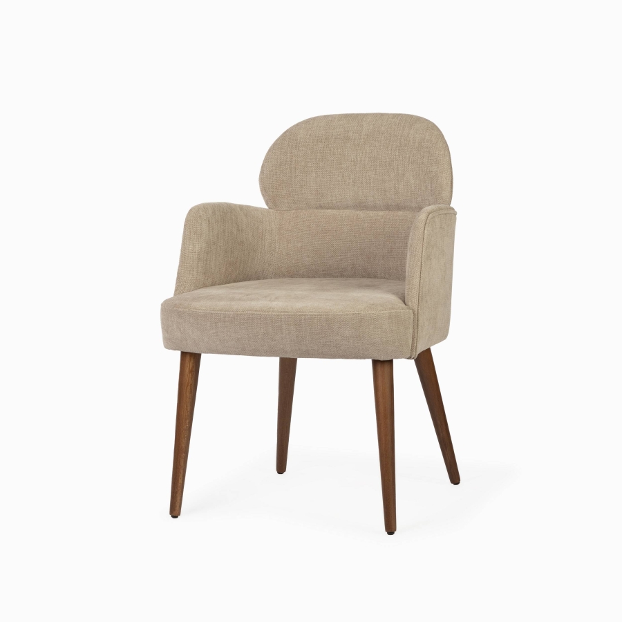 Обеденный стул Noma Arm — это сочетание скандинавского минимализма и функционального комфорта. Модель с подлокотниками обеспечивает дополнительный уют и поддержку, делая застолья и долгие беседы за столом еще более приятными. Теплый бежевый оттенок обивки из шенилла гармонирует с ножками из массива бука в цвете орех миланский, создавая уютную и стильную атмосферу.