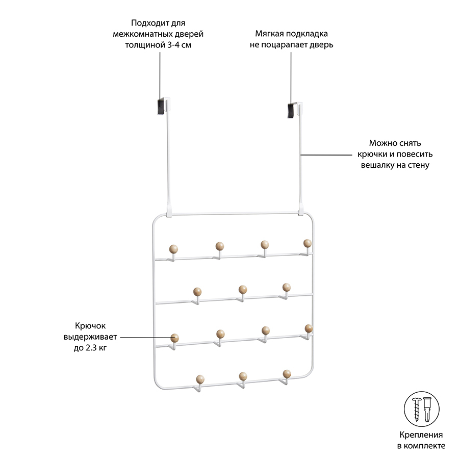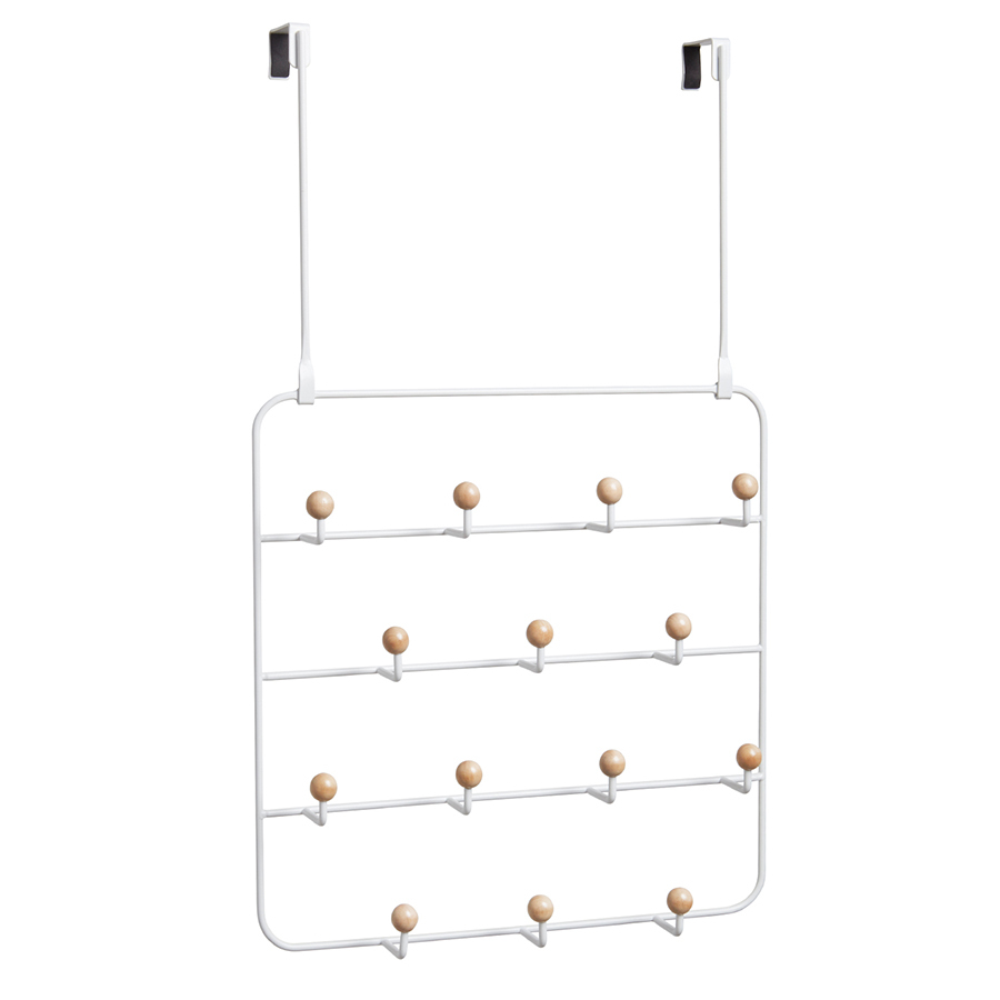 Органайзер предоставит дополнительное пространство для хранения верхней одежды и аксессуаров. Органайзер можно закрепить на стене или повесить на дверь с помощью специальных крючков. Подходит для дверей толщиной до 3,8 см. Деревянные шарики защищают вещи от растягивания. Органайзер оснащен 14 крючками. Материал: сталь, бук. Размеры: 36х11х60 см. Пыль и загрязнения удалять при помощи мягкой влажной салфетки. Запрещается использование агрессивной бытовой химии и абразивных материалов.