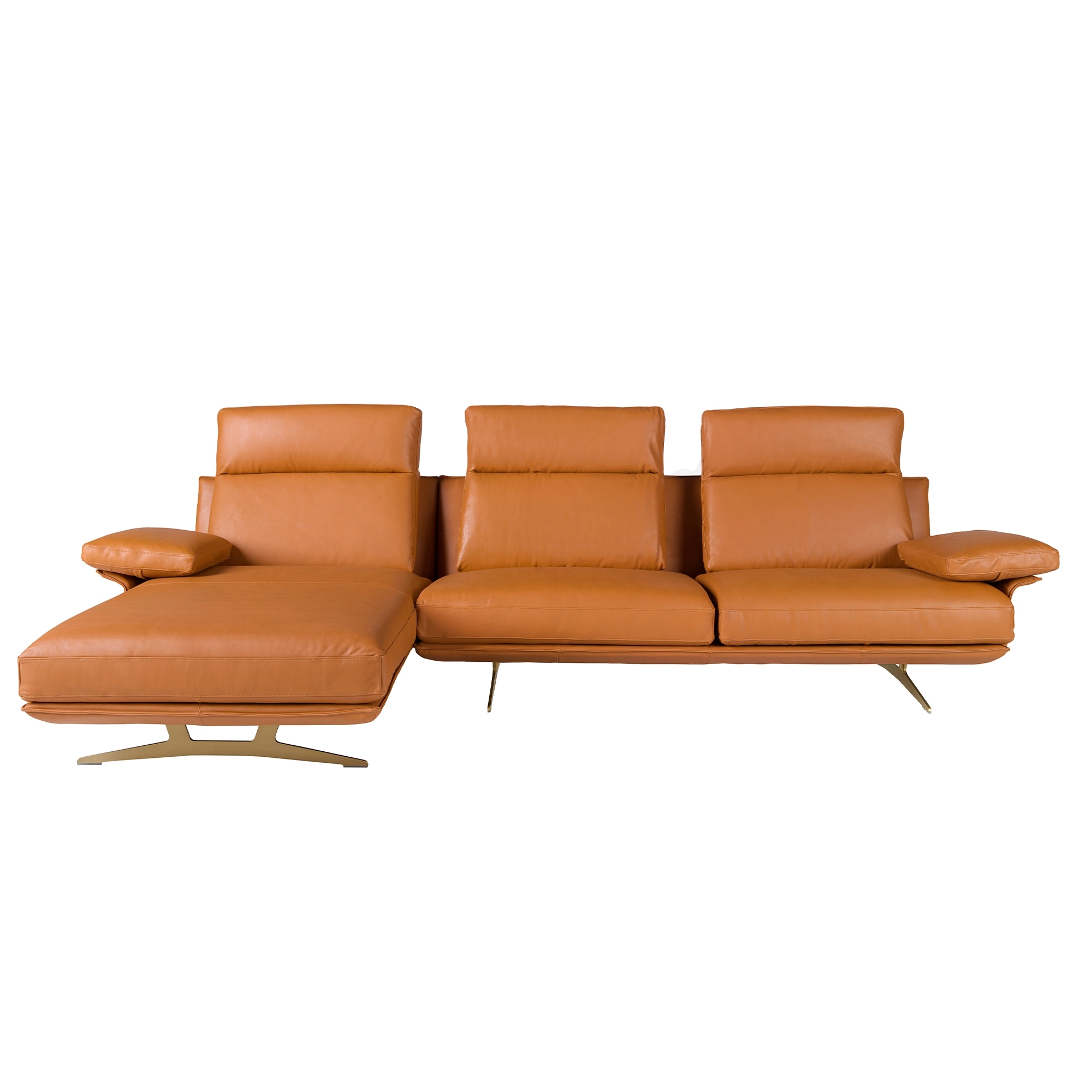 Пятиместный левый диван-шезлонг современного дизайна, обитый терракотово-коричневой коровьей кожей. Благодаря своему стилю и ножкам из нержавеющей стали золотистого цвета этот диван привнесет в ваш дом нотку авангарда и элегантности, которую вы ищете.