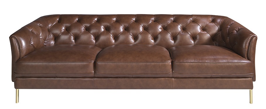 Трехместный диван Angel Cerda с капитоне (декоративная стяжка). Обивка из натуральной кожи шоколадного цвета (1 мм, гладкая фактура). Каркас из сосновой древесины. Наполнитель — ППУ плотностью 20 кг/м³. Ножки из стали, покрытые золотой гальванической краской, с наконечниками.