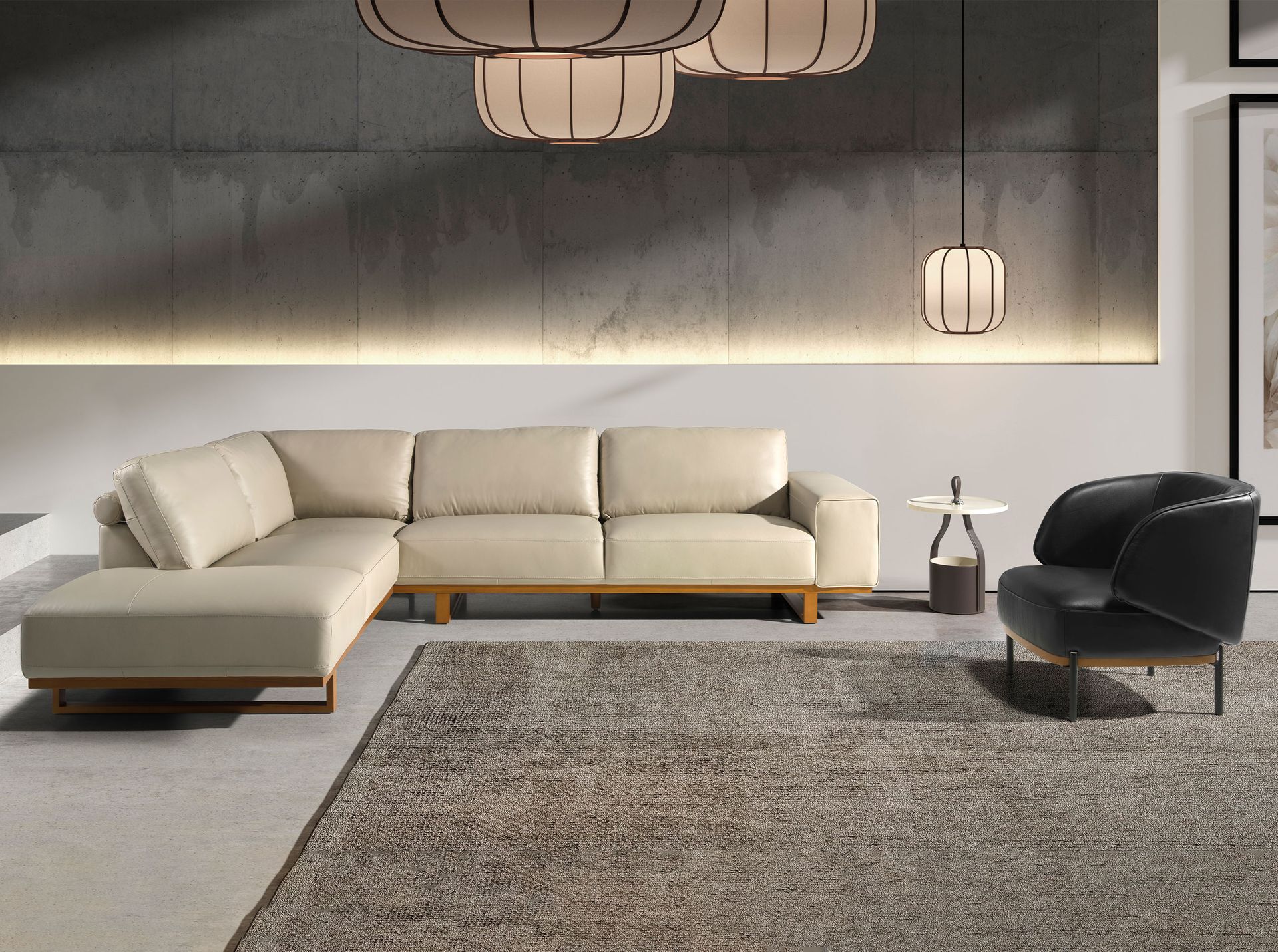 5-местный левый угловой диван с современным дизайном, обитый песочного цвета коровьей кожей. Как своим стилем, так и деревянными ножками медового цвета, этот диван привнесет нотку авангарда и элегантности, которую вы ищете для своего дома.