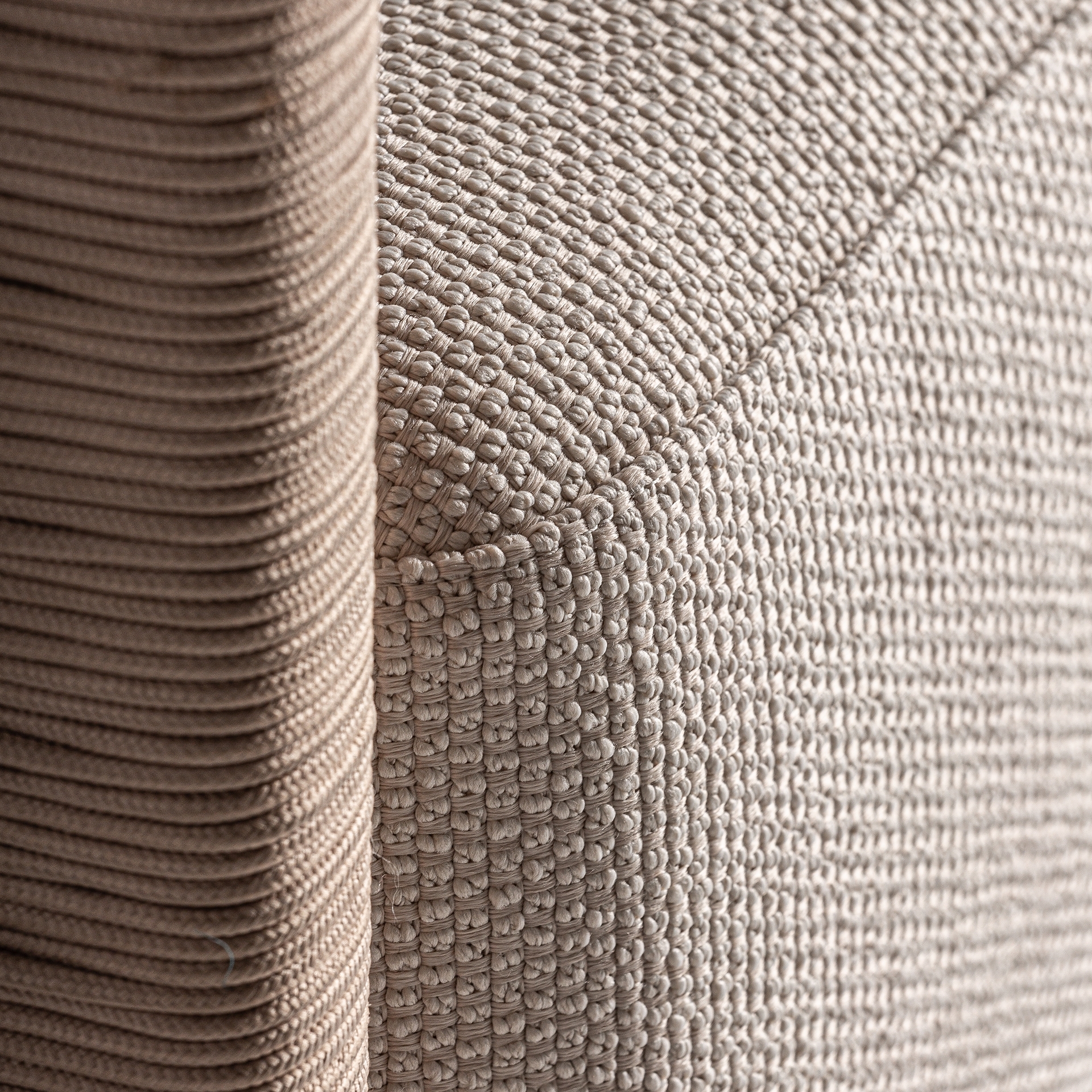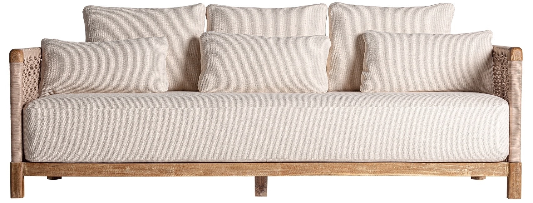Элегантность коллекции Trena — это сумма двух концепций: легкости и силы. Спинка представлена как обволакивающая деталь, охватывающая весь комплект, создавая интимное пространство, где основным материалом является веревка. На диване ротанг покоится на платформе из переработанного тикового дерева: конструкция, которая поддерживает его, приподнимает и придает ощущение невесомости, нежности и утонченности.