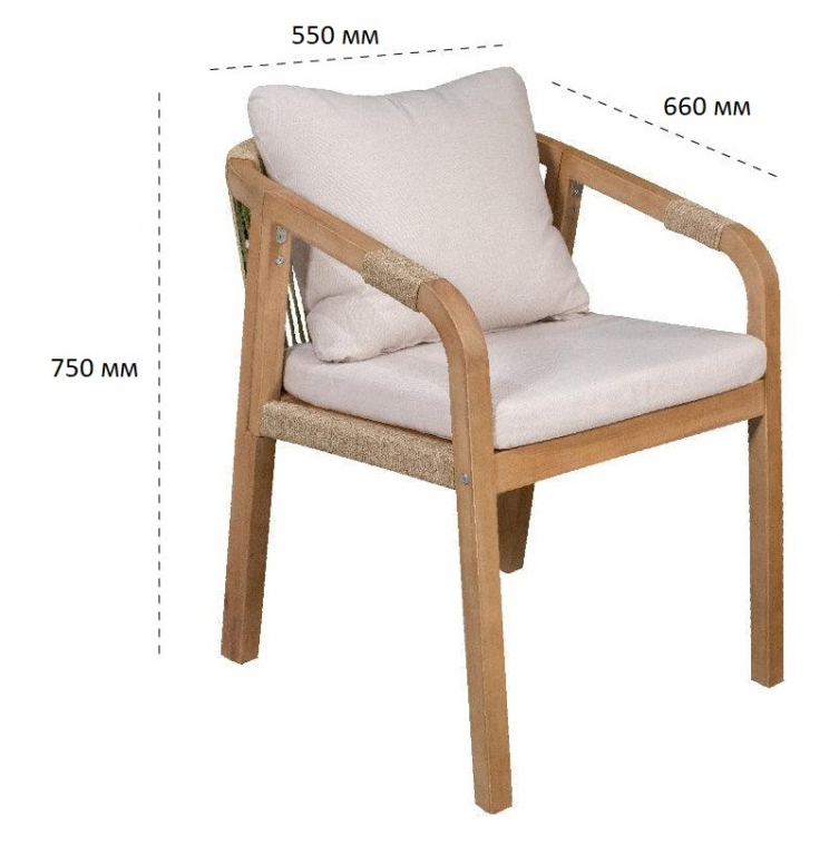 - Веревочное плетение: Стильное веревочное плетение диаметром 6 мм используется на спинках и подлокотниках кресел, создавая гармонию с деревянными поверхностями.
