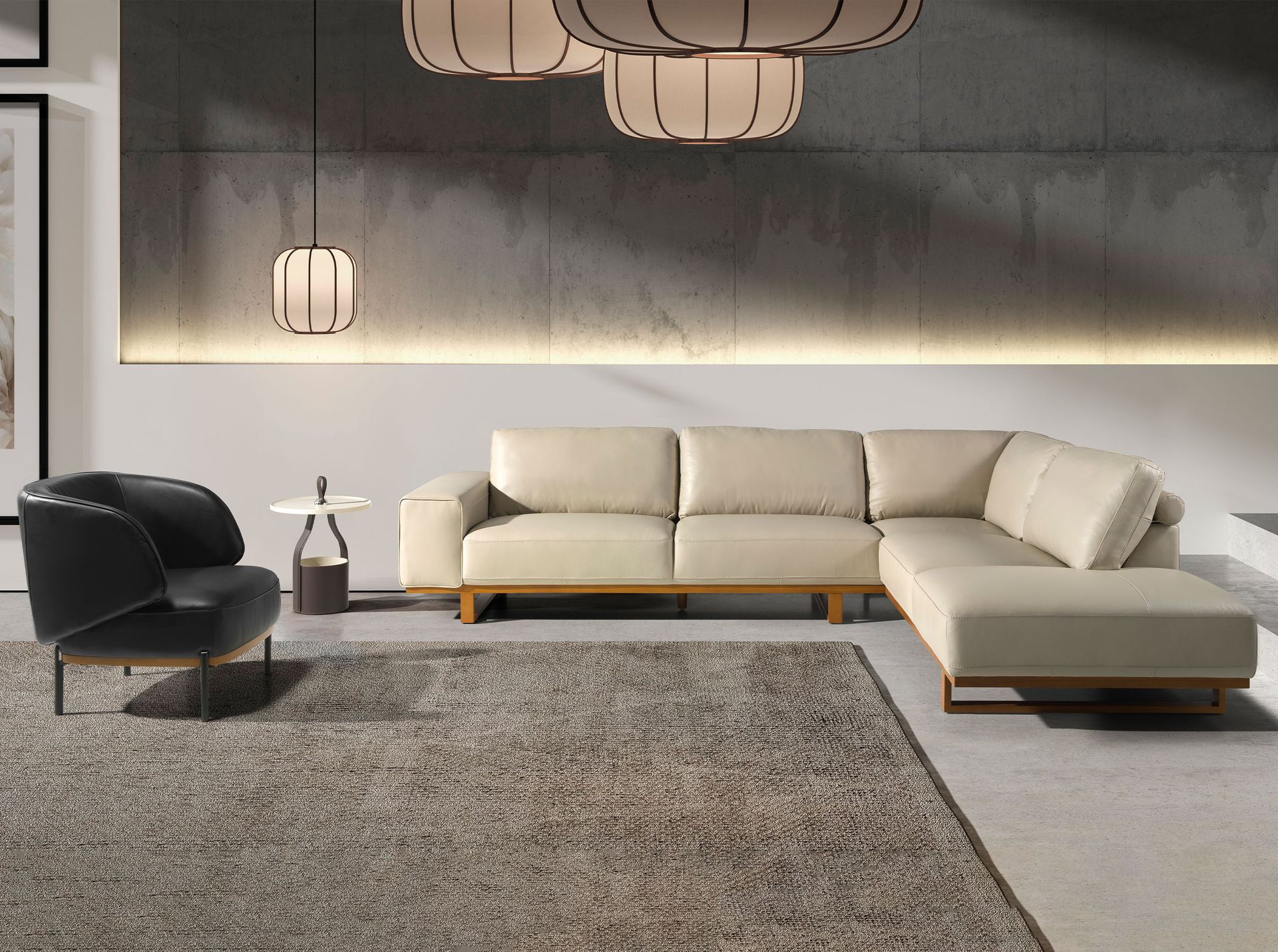Правый угловой диван 5 местный современный дизайн обитый воловьей кожей песочного цвета. Как своим стилем, так и своими деревянными ножками медового цвета, этот диван привнесет нотку авангарда и элегантности, которую вы ищете для своего дома.