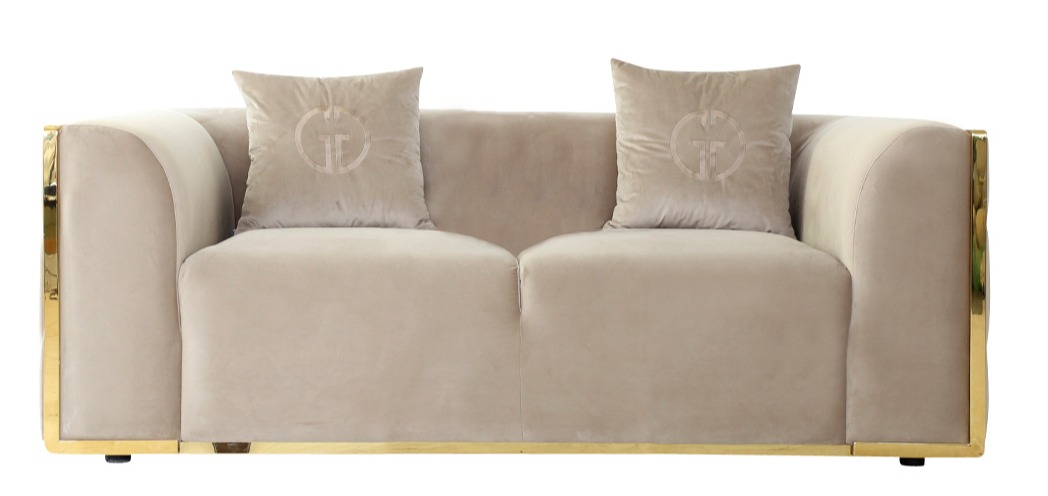 Двухместный диван Bern. Каркас из металла с золотым покрытием. Обивка из ткани бежевого цвета. Мягкая спинка, широкие подлокотники. В комплекте декоративные подушки.