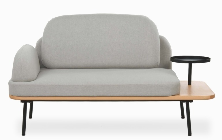 Двухместный диван Lie down с интегрированным столиком-подставкой. Каркас из массива бука, ножки металлические (чёрные матовые). Обивка из ткани. Компактный размер, подходит для небольших гостиных, студий или кабинетов.