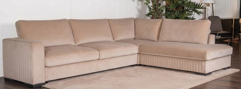 Угловой диван-кровать Marriotto от итальянского бренда Fratelli Barri. Каркас из металла и МДФ. Основание сиденья — металлические пружины «змейка» + блок независимых пружин. Опоры из массива бука. Сиденье — ППУ HR3020 (30 кг/м³) + холотек 200 г/м². Подлокотники и царга — ППУ 25/22 кг/м³ + холотек 100 г/м². Подушки «пух-перо» + холотек 200 г/м², с внутренними перегородками. Механизм трансформации — «Пума» с независимым пружинным блоком. В модулях хранения — газовые амортизаторы. Спальное место — 150×200 см. Ткань — микровелюр Paddington с перламутровым эффектом (100% полиэстер).