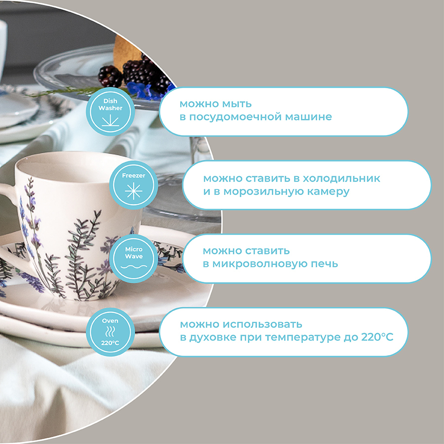 Набор фарфоровых кружек Floral в элегантном дизайне украсит стол и разнообразит сервировку. Цветущая лаванда, изображенная на белоснежной поверхности, превращает посуду в декоративный элемент. Материал изготовления неприхотлив в уходе, не впитывает загрязнения, является экологичным и безопасным для здоровья. Кружка с рисунком в подарочной упаковке станет отличным приобретением и приятным презентом к празднику. Чистое сырье высочайшего качества и собственная формула глазуровки с обжигом при температуре 1250 °C делают изделия из фарфора особо прочными, устойчивыми к растрескиванию и появлению сколов. Глазурь и декор не тускнеют со временем, сохраняя первоначальный цвет и блеск. Наши продукты прошли испытания на отсутствие в составе свинца и кадмия в соответствии со стандартными тестами FDA. Материал: фарфор. Размеры: 9х9х12,5 см. Объем: 325 мл. Количество предметов в наборе: 2 шт. Можно мыть в посудомоечной машине, ставить в микроволновую печь, морозильную камеру, а также использовать в духовке при температуре не выше 180 °C.