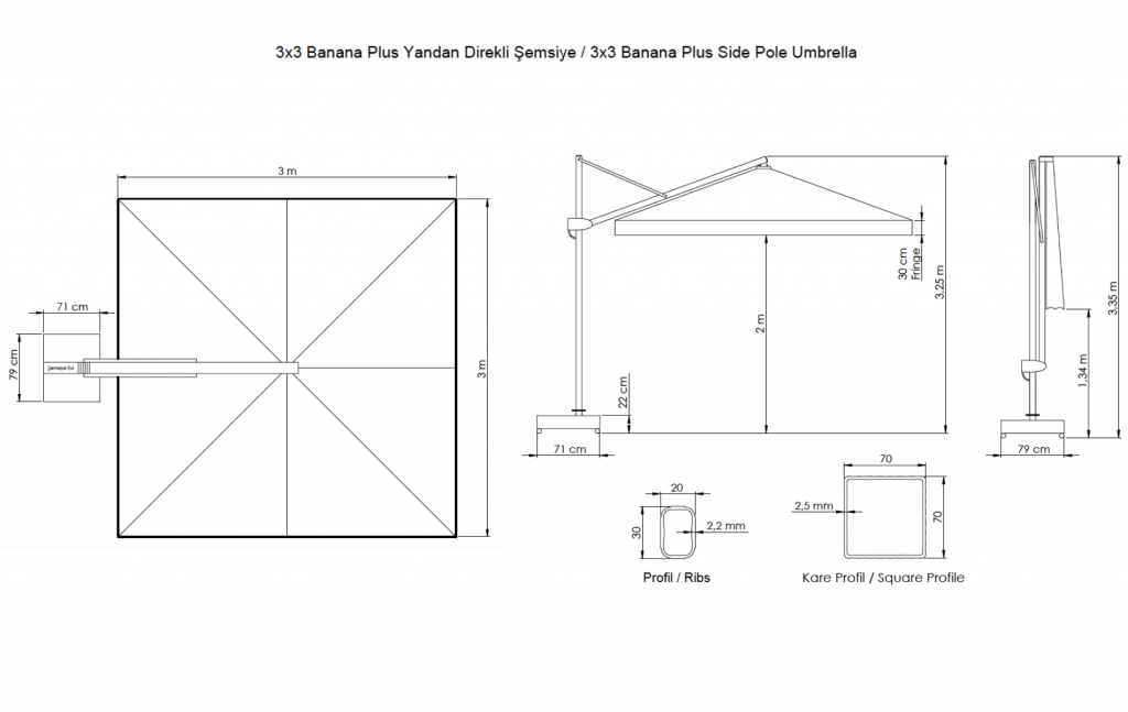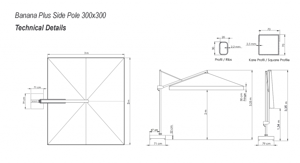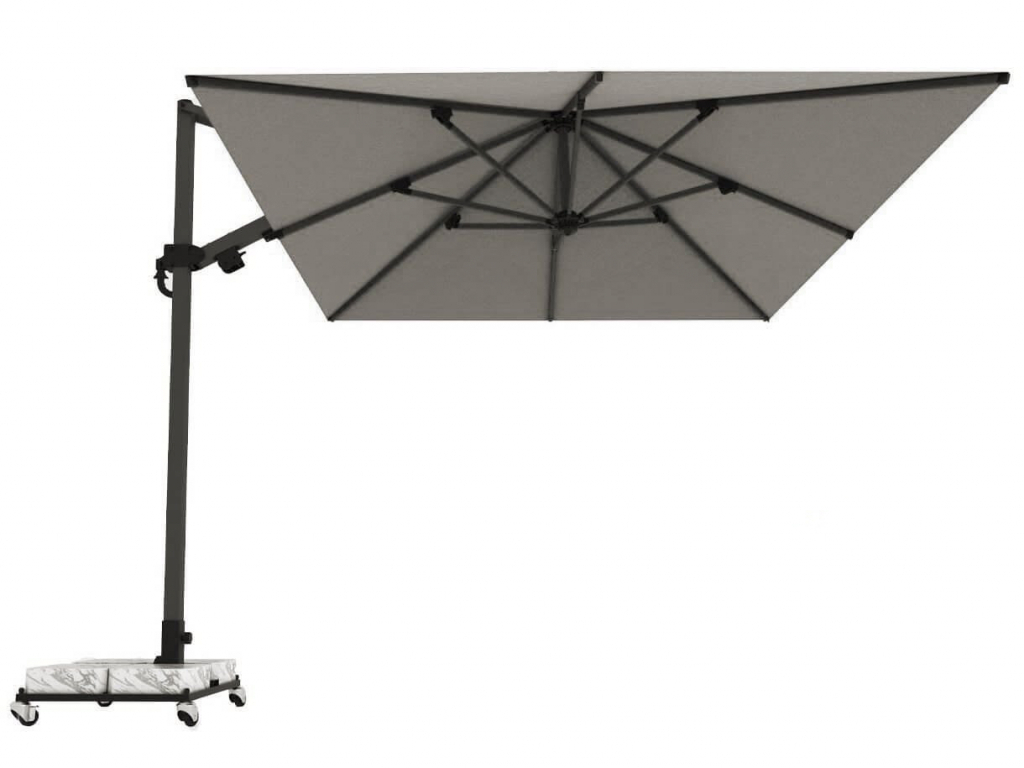 Banana Plus- новейшая модель компанииTHEUMBRELA, сочетающая в себе высококачественные материалы, впечатляющие технологии и простое управление. Это особенный продукт для тех, кто ищет крутой дизайн, стильный внешний вид и функциональность среди зонтов с боковой опорой. Зонт легко открывается и закрывается при помощи рукоятки, а сам механизм блокируется для безопасности. Купол может подниматься под углом до60°. Для того, чтобы закрыть или открыть зонт Banana Plus, не нужно двигать мебель под ним. Особенности: Боковая опора сечением 70х70 мм и толщиной стенки 2.5 мм выполнена из окрашенного алюминия со специальной термообработкой, которая повышаетпрочность и коррозионную стойкость зонта. Высота опоры - 3100 мм. 8 спиц из алюминия сечением20х30 мм и толщиной стенки 2 мм. Термообработанный и усиленный кронштейн и каркас. Прочные пластиковые детали и соединительные элементы. В комплект входит металлическая база на колесах, размер: 790х710х60 мм,с мраморными утяжелителями, размер: 340х340х120 мм. Вес базы 24 кг, каждый утяжелитель 34 кг. Общий вес базы 160 кг. Размер упаковки: 850х750х100 мм. Функциювращения на 360º можно приобрести дополнительно. Покрытие опоры и спиц цвета антрацит. Купол без волана выполнен из ткани олефин светло-серого цвета (2631). Вес ткани купола 10 кг, объем 0,2 м3. Обращаем Ваше внимание! Плиты идут в подарок к зонту! В норме допускаются незначительные сколы и царапины мрамора по периметру, т.к. мрамор - это природный материал.На плиты рекламации не принимаются, Вы имеете право безвозмездно отказаться от них. Цена на сайте указана за модель с каркасом цвета антрацит и куполом из ткани олефин. Цены на другие модели Вы можете уточнить у менеджеров.