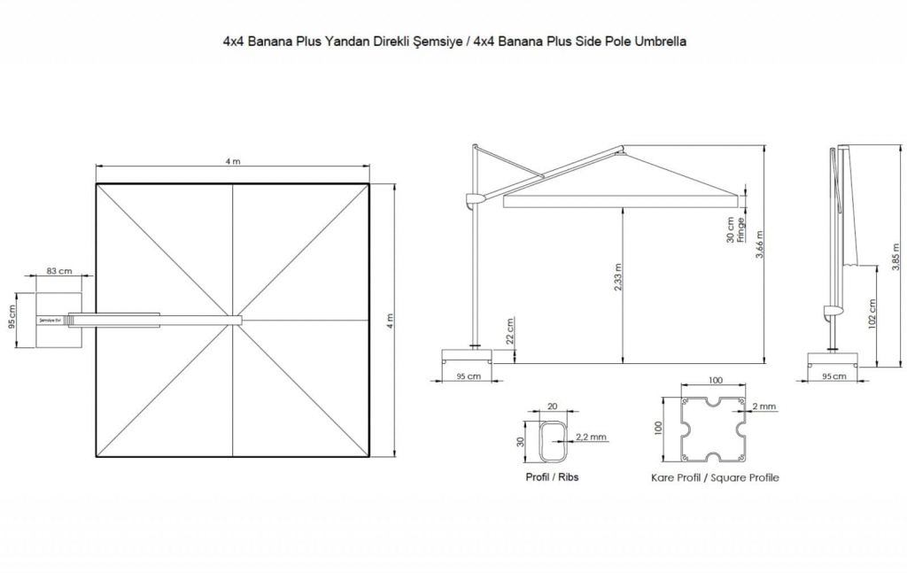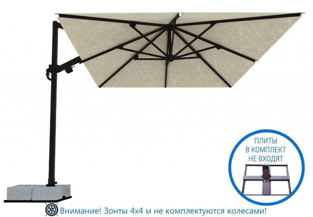 Banana Plus- новейшая модель компанииTHEUMBRELA, сочетающая в себе высококачественные материалы, впечатляющие технологии и простое управление. Это особенный продукт для тех, кто ищет крутой дизайн, стильный внешний вид и функциональность среди зонтов с боковой опорой. Зонт легко открывается и закрывается при помощи рукоятки, а сам механизм блокируется для безопасности. Купол может подниматься под углом до60°. Для того, чтобы закрыть или открыть зонт Banana Plus, не нужно двигать мебель под ним. Особенности: Боковая опора сечением 100х100 мм и толщиной стенки 2мм выполнена из окрашенного алюминия со специальнойтермообработкой, которая повышаетпрочность и коррозионную стойкость зонта. Высота опоры - 3660 мм. 8 спиц из алюминия сечением20х30 мм и толщиной стенки 2.2 мм. Термообработанный и усиленный кронштейн и каркас. Прочные пластиковые детали и соединительные элементы. В конструкции купола предусмотрен вентиляционный клапан, который помогает зонту выдерживать сильные порывы ветра. В комплект входит металлическая база 950х950 мм без колес иутяжелителей. Дополнительно можно приобрести утяжелительные плиты, арт.AVT/TR-4040-10. Необходимое количество плит на 1 зонт: 8 шт. Дополнительно можно приобрести утяжелительные плиты. Функциювращения на 360º можно приобрести дополнительно. Покрытие опоры и спиц черного цвета. Купол выполнен из тканиDickson Grege 6020 (100% акрил). Цена на сайте указана за модель с каркасом черного цвета и куполом из акрила. Цены на другие модели Вы можете уточнить у менеджеров.