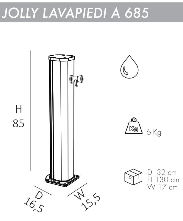 Благодаря своему небольшим размерам и простому управлению душдля ногJolly Lavapiedi A685 подходитдля установки на открытом воздухе в гостиницах, кемпингах, туристическихили пляжныхкурортах,илидля частного использования. Душ оснащен краном для мытья ног,благодаря которомуудобство в использовании возрастает в несколько раз. Особенности: колонна выполнена изалюминияс порошковым антикоррозийным покрытием, которое обеспечивает долгий срок службы и устойчивость кразличным погодным воздействиям; кран для мытья ног с интервалом подачи воды 15 сек; винты для крепления в комплекте; возможность крепления к песку или газону с помощью винта D125 и меламиновой плиты D180 (приобретаются отдельно); простая установка не требует специальных навыков, простое подключение к любому садовому шлангу или постоянному водоснабжению; размер входящей трубы для подключения воды 1,27 см; широкая палитра цветов. Скачать инструкцию по установке. Скачать техническую карту.