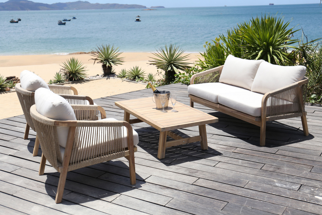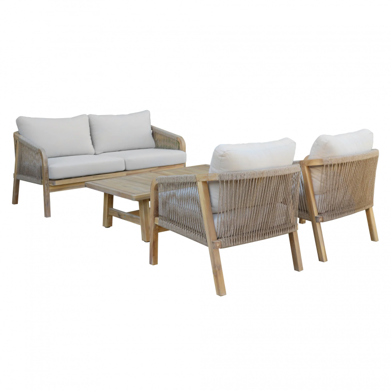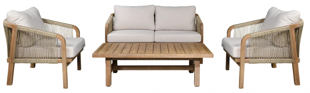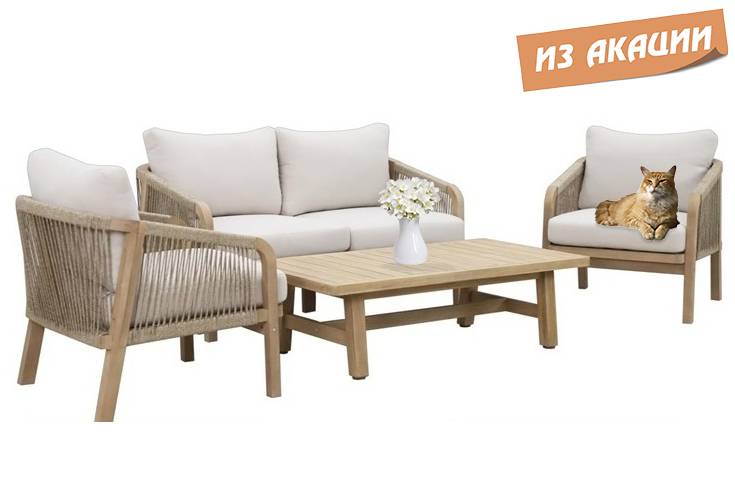 Диванная группа Ravona, рассчитанная на 4 персоны, - это садовая мебель из АКАЦИИ в современном стиле.Дизайнерские формы мебели из этой коллекции создадут стильный и узнаваемый облик зоны отдыха на вашей веранде. Ravona - этосовременная коллекция садовой мебели из акации, выполненная в комбинации натурального веревочного плетения роуп, акации и бежевых подушек. Цвет натуральной твердой древесины представляет собой натуральный цвет с мелкой текстурой, придающий древесине приятный теплый вид. Ravona- это стиль и элегантность на Вашей веранде. Особенности: Материал -АКАЦИЯ,отделка экомаслом тик Light #01A. Веревочное плетение роуп 6 мм толщиной на спинкеиподлокотниках кресел излучает стиль в сочетании с деревянными поверхностями. Древесина, из которой изготовлена мебель, имеет сертификацию FSC (Forest Stewardship Council) - гарантия качества и происхождения древесины.Знак FSC - показатель того, что продукция происходит из леса, в котором ведется экологически и социально ответственное лесное хозяйство.Благодаря своей долговечности, прочности и устойчивости к вредителям эта древесина была создана для изготовления садовой мебели.Страна происхождения древесины: Вьетнам, Малайзия. Средняя плотность древесины: 550 кг/м3. Анодированная фурнитура из нержавеющей стали. Подушки в комплекте, ткань подушек - олефин, наполнитель - толстый поролон. Материалы устойчивы к УФ-излучению и другим погодным воздействиям. Цвет подушек - бежевый. Состав комплекта: Кресло Ravona KD (Арт. TAG/HUC25687KD), размер 680х795х685 мм- 2шт. Диван Ravona KD 2-х местный (Арт. TAG/HUC25686KD), размер 1380х795х685 мм - 1шт. Кофейный стол Ravona (Арт. TAG/HUC37159), размер 1275х650х360мм-1 шт. Данные упаковки: 2 кресла:Вес нетто: 30кг. Вес брутто: 35 кг. Размер упаковки: 830х790х655 мм. Кофейный стол:Вес нетто: 15кг. Вес брутто: 17.5кг. Размер упаковки: 1325х700х105 мм. Открыть инструкцию по уходу.