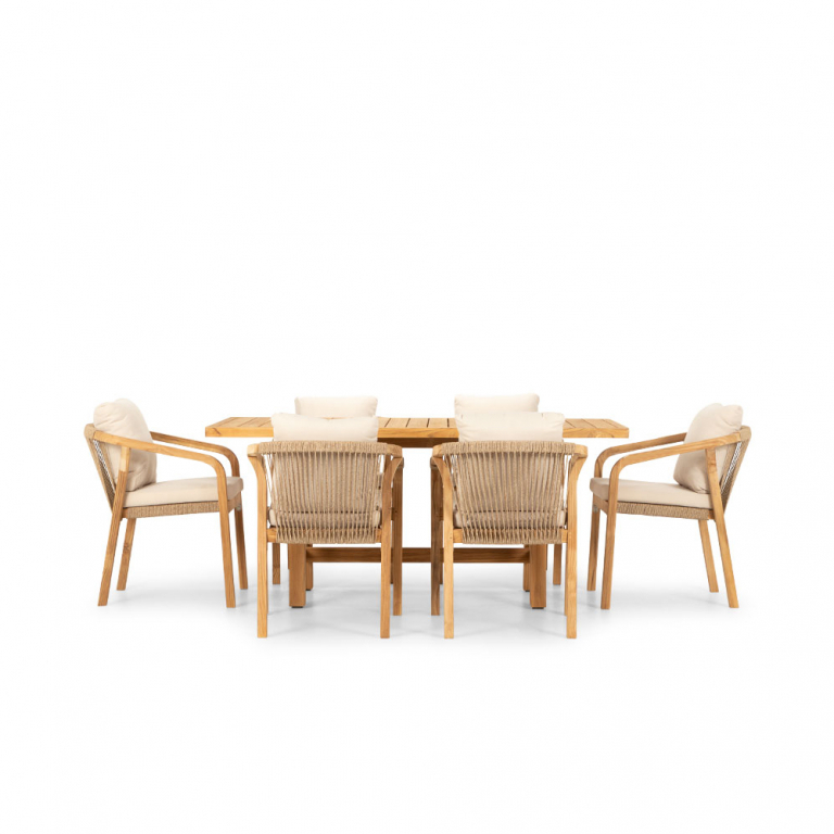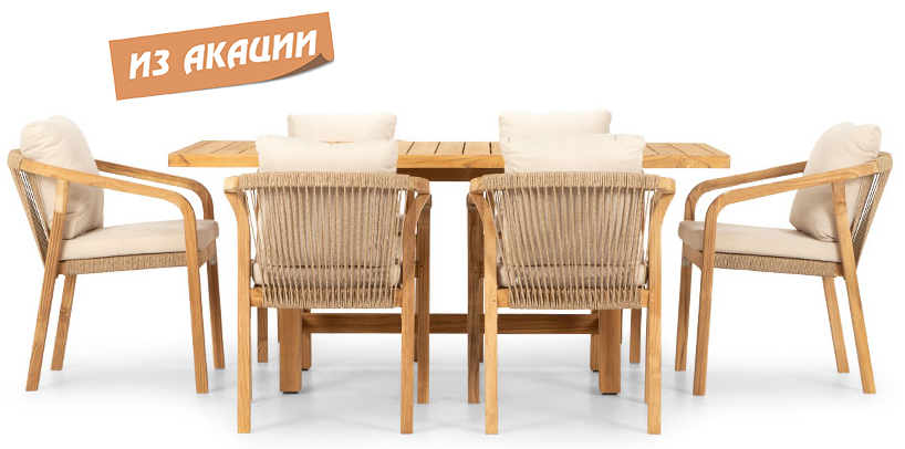 Обеденная группа Ravona, рассчитанная на 6 персон, - это садовая мебель из АКАЦИИ в современном стиле. Дизайнерские формы мебели из этой коллекции создадут стильный и узнаваемый облик зоны отдыха на вашей веранде. Ravona - это современная коллекция садовой мебели из акации, выполненная в комбинации натурального веревочного плетения роуп, акации и бежевых подушек. Цвет натуральной твердой древесины представляет собой натуральный цвет с мелкой текстурой, придающий древесине приятный теплый вид. Ravona - это стиль и элегантность на Вашей веранде. Особенности: Материал - АКАЦИЯ, отделка экомаслом тик Light #01A. Веревочное плетение роуп 6 мм толщиной на спинке и подлокотниках кресел излучает стиль в сочетании с деревянными поверхностями. Древесина, из которой изготовлена мебель, имеет сертификацию FSC (Forest Stewardship Council) - гарантия качества и происхождения древесины. Знак FSC - показатель того, что продукция происходит из леса, в котором ведется экологически и социально ответственное лесное хозяйство. Благодаря своей долговечности, прочности и устойчивости к вредителям эта древесина была создана для изготовления садовой мебели. Страна происхождения древесины: Вьетнам, Малайзия. Средняя плотность древесины: 550 кг/м3. Анодированная фурнитура из нержавеющей стали. Подушки в комплекте, ткань подушек - олефин, наполнитель - толстый поролон. Материалы устойчивы к УФ-излучению и другим погодным воздействиям. Цвет подушек - бежевый. Состав комплекта: Обеденный стол Ravona (Арт.HUC37160-1), размер 1700х900х750 мм - 1 шт. Кресло Ravona KD (Арт.HUC25690KD), размер 550х660х750 мм - 6 шт. Инструкция по уходу.