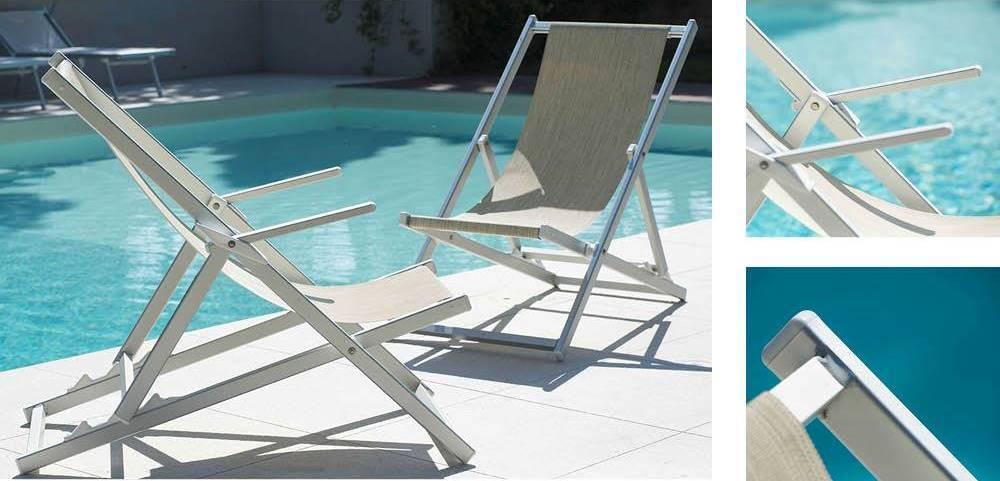 Sdraio - это кресло-шезлонг, пригодное для использования на пляже у моря, около бассейнов и на даче. Сочетает в себе легкость с исключительной прочностью, что позволяет обеспечить сохранность изделия на протяжении 12 лет эксплуатации. Алюминиевое кресло-шезлонг Sdraio - хорошая альтернатива шезлонгуили дополнение к саду, пляжу и площадки возлебассейна. Особенности модели: Каркас выполнен из закаленного алюминия. Перед сборкой все детали подвергаются анодированию (процесс сертифицирован QUALANOD). Все элементы собраны с использованием деталейиз нержавеющей стали AISI 304 и шайб из AISI 316. Между стальных деталей вставлены нейлоновые шайбы для снижения износа при трении. Все пластиковые элементы выполнены с использованием высококачественного нейлона. Кресло выполнено без подлокотников.Для заказа также доступна модель со складными подлокотниками. Шезлонг легко складывается, что позволяет легко перемещать и хранить. Тканевое покрытие - текстилен - производится с использованием нити из полиэфира с ПВХ. Результатом является ткань высокой прочности, которая обеспечивает долговечность, износостойкость и приятный внешний вид. Все ткани производятся в Италии и сертифицированы OEKO TEX® - STANDARD 100 на отсутствиевредных веществ и сертифицированы CATAS на прочность на разрыв и износостойкость. Варианты отделки каркаса:анодированный серебристый (стандартная), анодированный бронзовый, глянцевый белый, окрашенный бежевый, антрацит и другие цвета по палитре RAL (окрашивание RAL доступно при заказе от 50 шт.). Упаковка:кресла упаковываются вкартоннуюкоробку 100x750x1340 мм по 2 шт,вес коробки10 кг, объем коробки 0.10м3. Цена варьируется в зависимости от выбранной ткани и отделки каркаса. В базовую цену включена следующая комплектация: 3 положения спинки, без подлокотников. Цена на сайте указана за модель 400 с анодированным серебристым каркасом. Цены на другие модели и дополнительную информацию уточняйте у менеджеров.