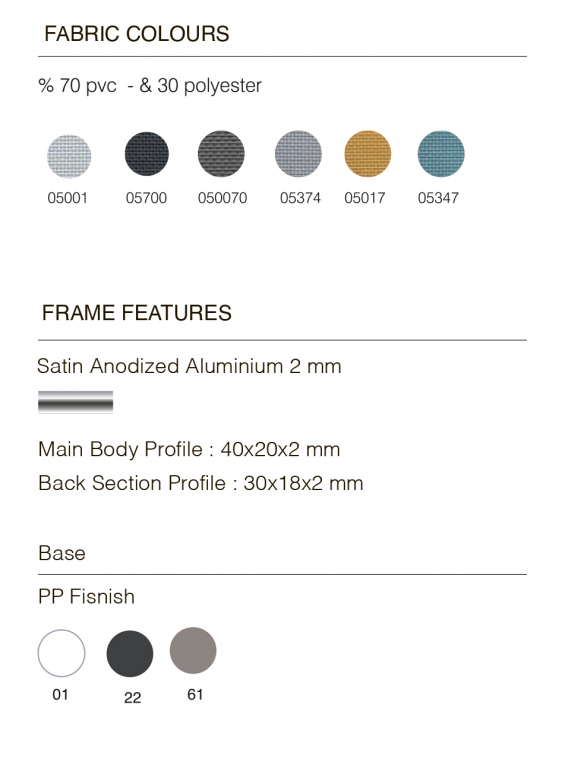 Ткань: сетчатая Batyline от Serge Ferrari (70% ПВХ, 30% полиэстер) — абсолютно водостойкая, устойчивая к УФ-излучению, плесени, хлору и соли. Цвет «антрацит» специально создан для постоянного контакта с водой.
