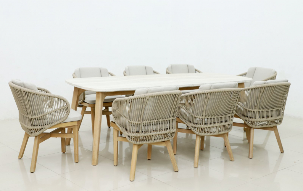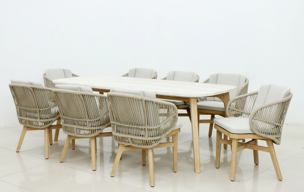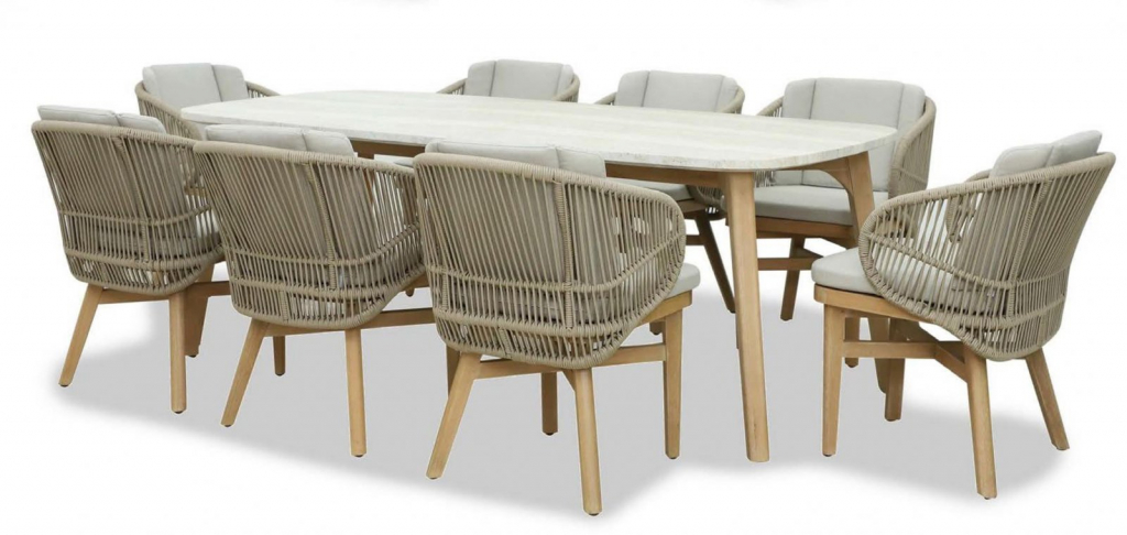 Эксклюзивная коллекция Maliприглашает вас окунуться в стиль и безмятежность на открытом воздухе. Большой обеденный стол, рассчитанный на 8 персон,выполнен из эвкалипта, столешница с утонченным краем в виде акульего носа - из искусственногокамня Travertine. Ансамбль из эвкалипта с обеденным столом соригинальнойстолешницейи восемью мягкими креслами с плетением из роупа, создан для незабываемых моментов на свежем воздухе. Особенности: Материал -ЭВКАЛИПТ,отделка экомаслом тик Light #01A. Древесина, из которой изготовлена мебель, имеет сертификацию FSC (Forest Stewardship Council) - гарантия качества и происхождения древесины.Знак FSC - показатель того, что продукция происходит из леса, в котором ведется экологически и социально ответственное лесное хозяйство.Благодаря своей долговечности, прочности и устойчивости к вредителям эта древесина была создана для изготовления садовой мебели.Страна происхождения древесины: Уругвай. Средняя плотность древесины: 550-600 кг/м3. Столешница обеденного стола выполнена из искусственногокамня Travertine. Инструкция по уходу.