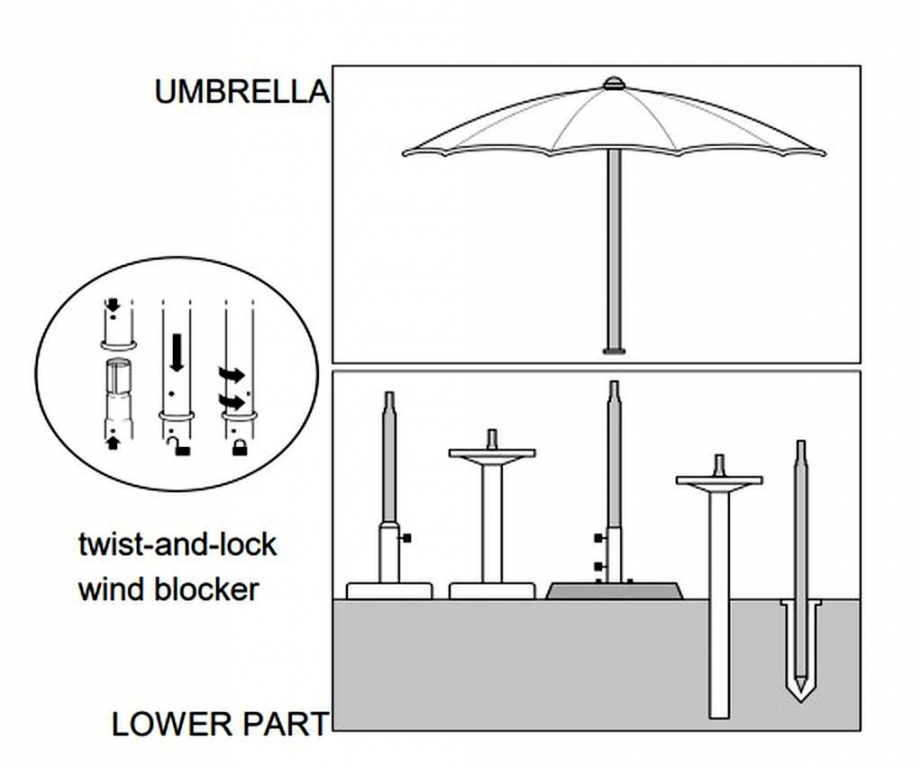 | Особенности | Байонетная система блокировки при ветре, ручка из нержавеющей стали, устойчивость к соленой воде, острие для установки в песок |