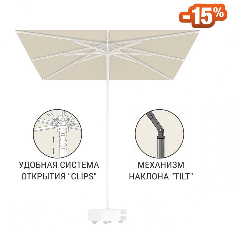 Kiwi Clips — это больше, чем просто зонт. Профессиональная модель с центральной опорой из алюминия обеспечивает высокую устойчивость и надежную защиту от солнца. Квадратный купол 2х2 метра создает геометрически правильную тень, идеально подходящую для обеденных столов и зон отдыха. Уникальная система зажимов позволяет открывать и закрывать зонт одним легким движением руки. Встроенный наклонный механизм дает возможность регулировать угол купола в течение дня. Журнальный столик и пепельница делают модель невероятно функциональной. Классический бежевый цвет впишется в любой интерьер или ландшафт. Создайте комфортную затененную атмосферу с безупречным испанским стилем.