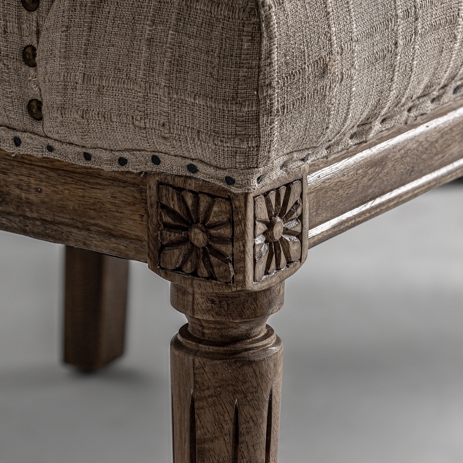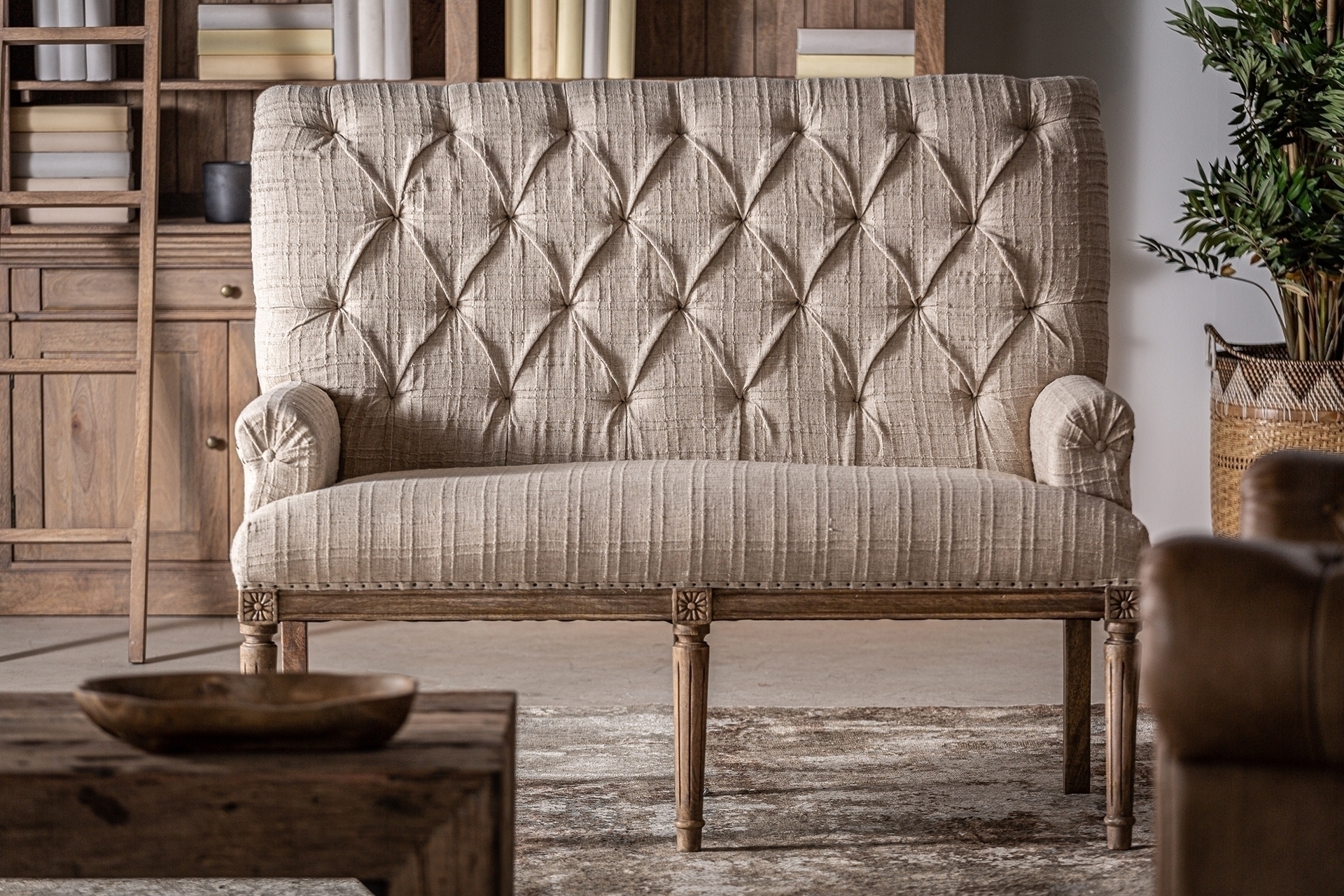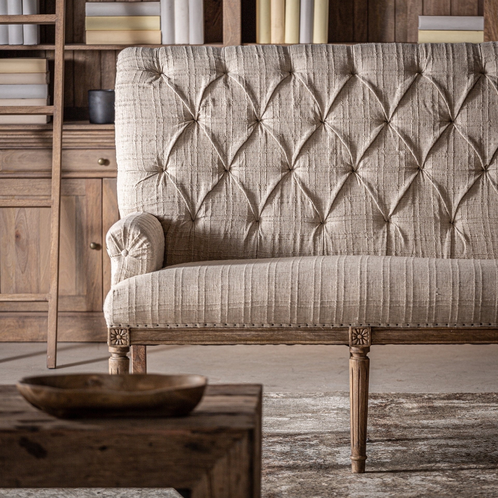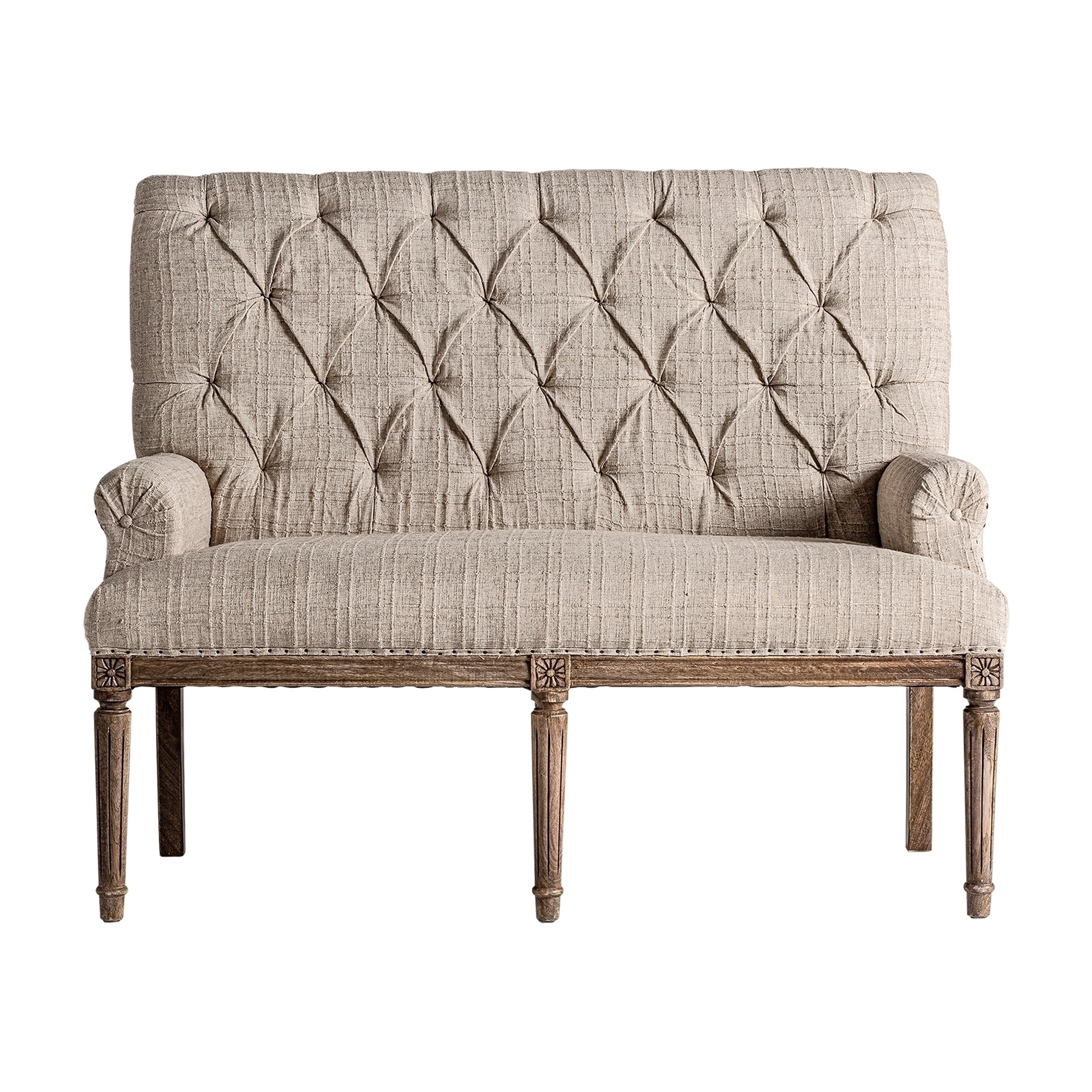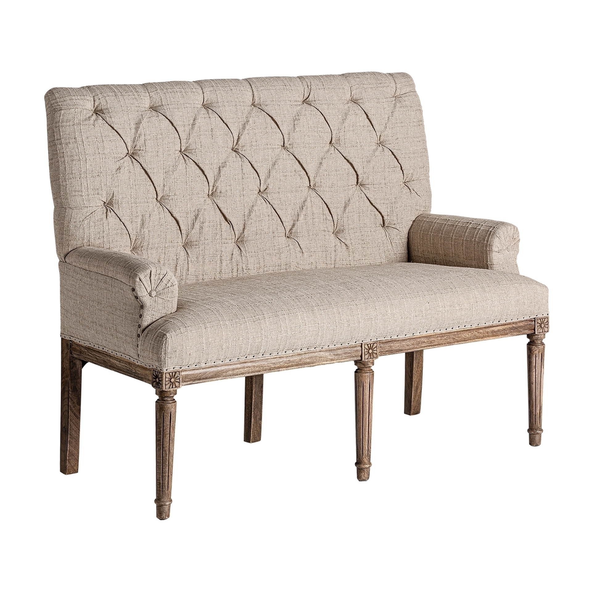 Барный диван Hestroff, бежевого цвета, в классическом стиле. Изготовлен из древесины манго в сочетании с полиэстером и пеной.