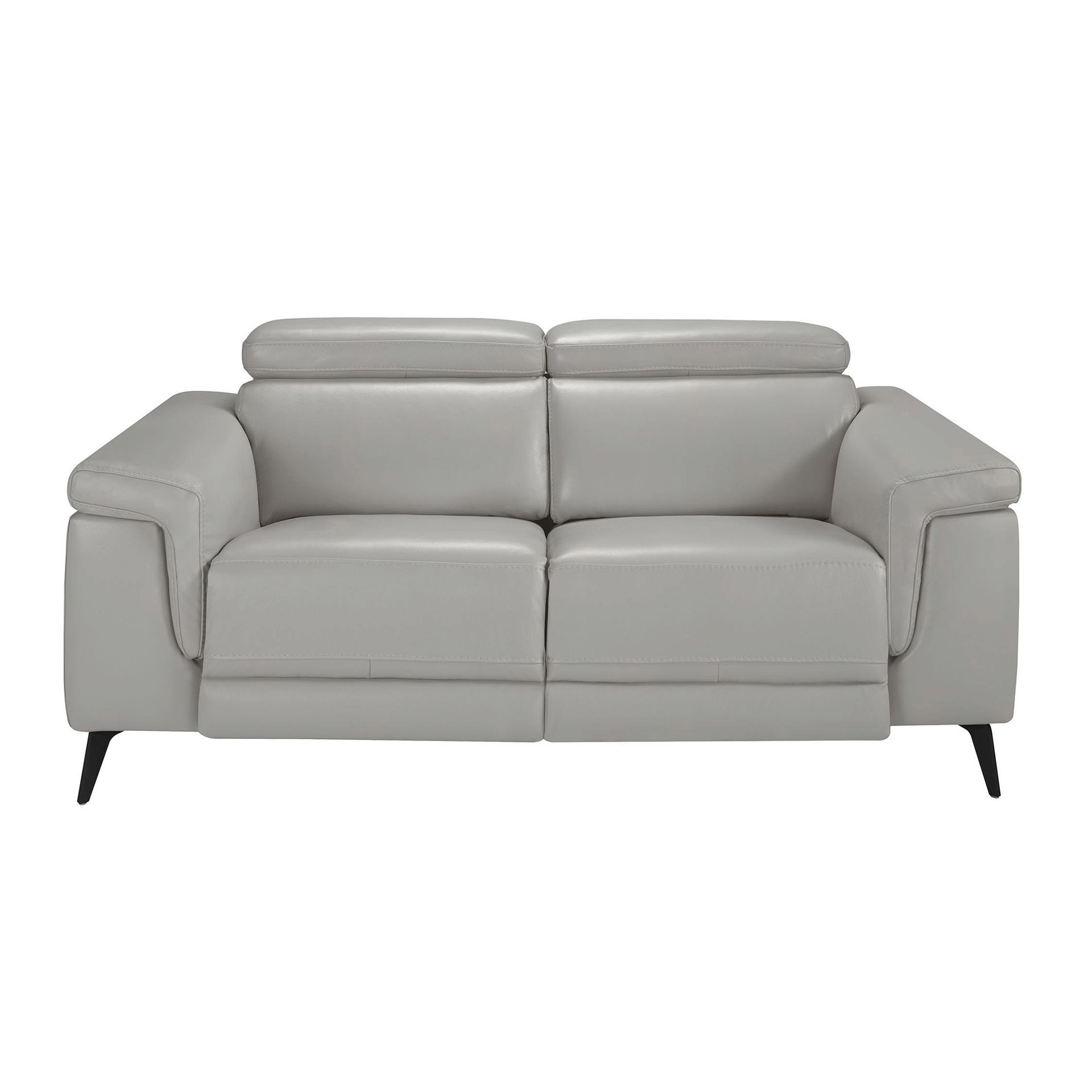 2-местный диван с обивкой из воловьей кожи серого цвета со структурой из натуральной древесины сосны, независимыми шарнирными подголовниками и двумя электрическими механизмами релаксации. Ноги из твердой стали, окрашенной черной эпоксидной смолой.