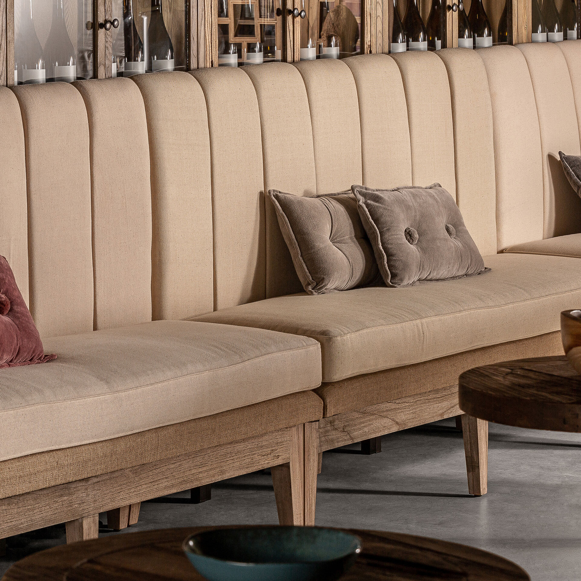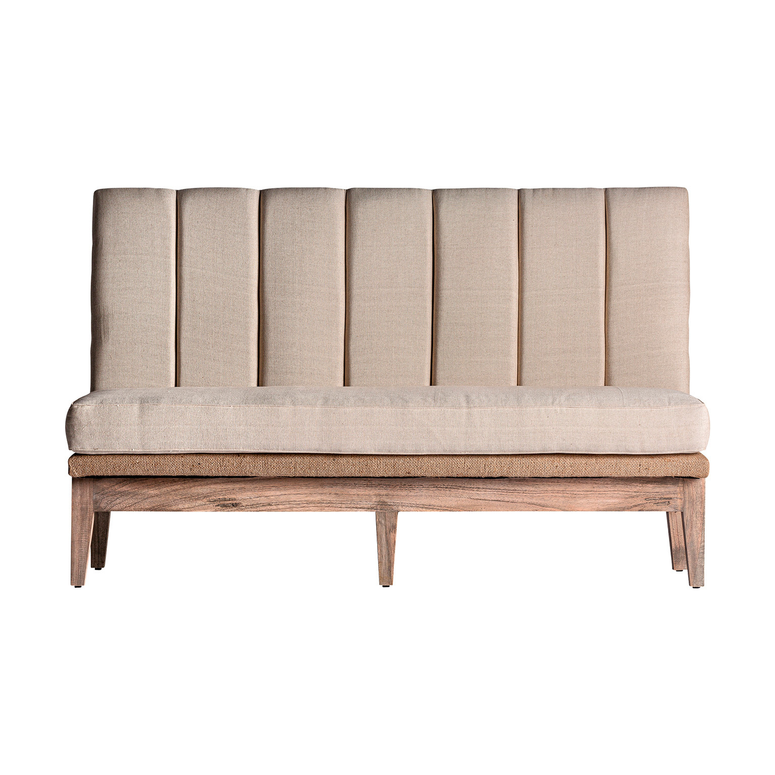 Диван барный retz, кремовый цвет, стиль прованс. Изготовлен из тикового дерева в сочетании с льном. Ширина: 174 см, Глубина: 63 см, Высота: 112 см.