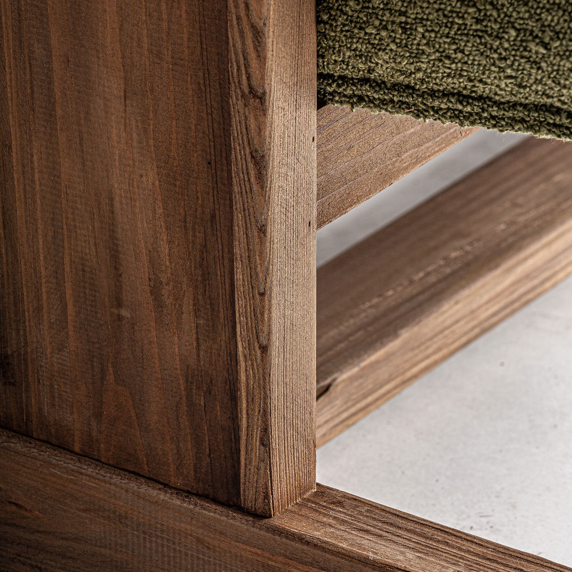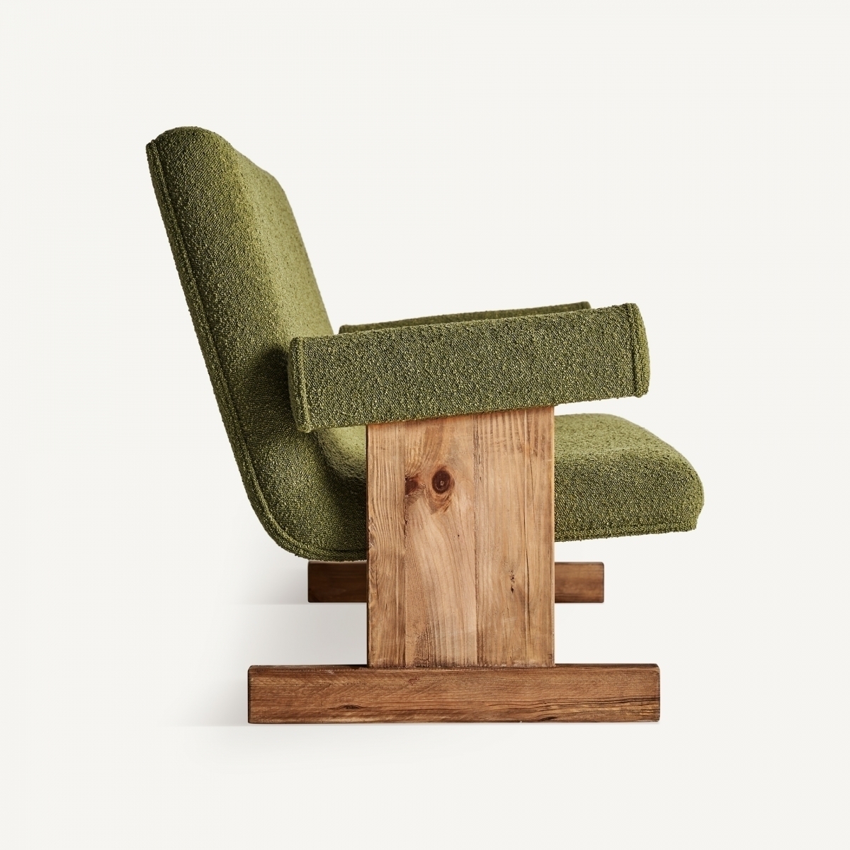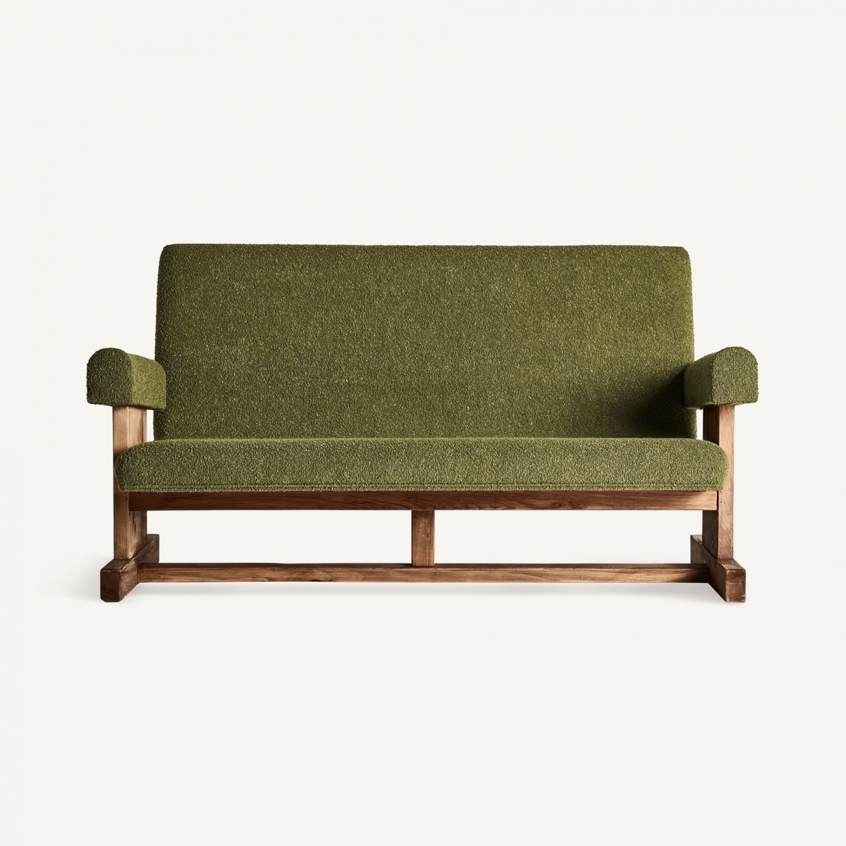 Диван Creusot зеленого цвета в стиле арт-деко. Изготовлен из переработанной древесины сосны в сочетании с полиэстером.