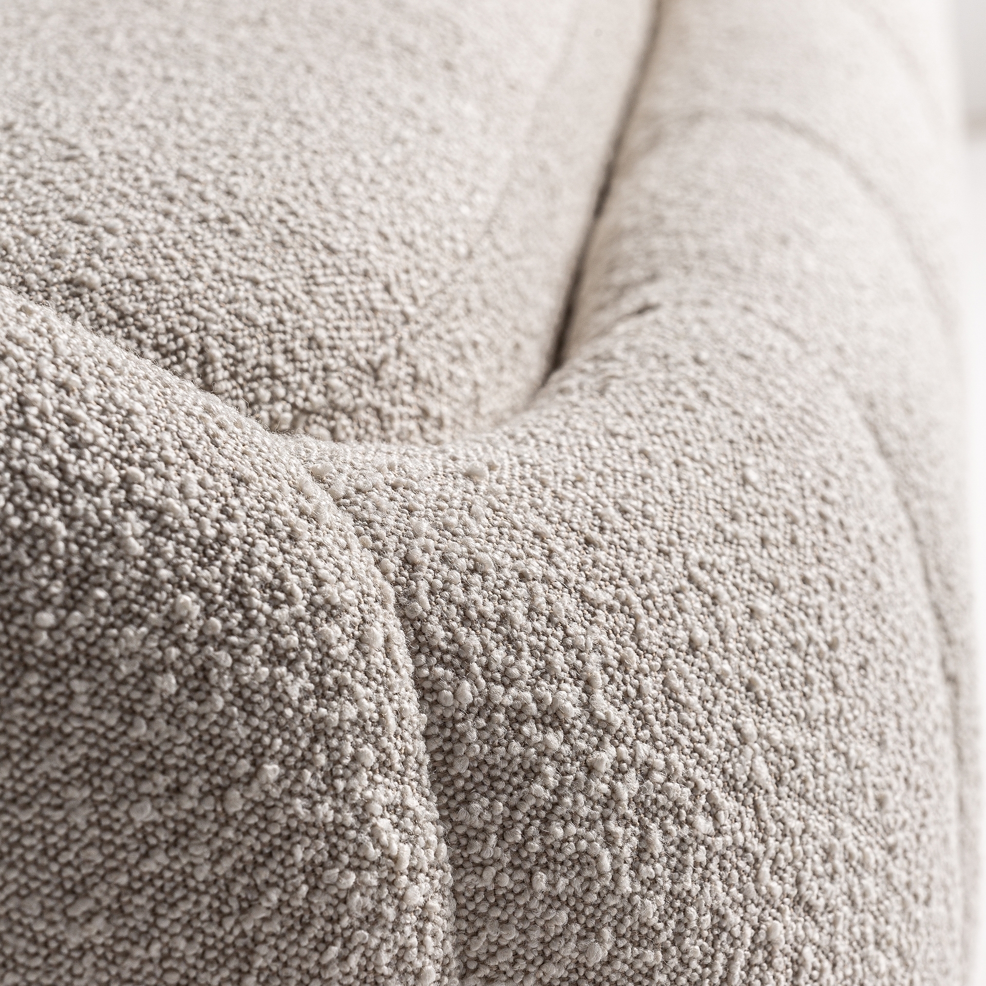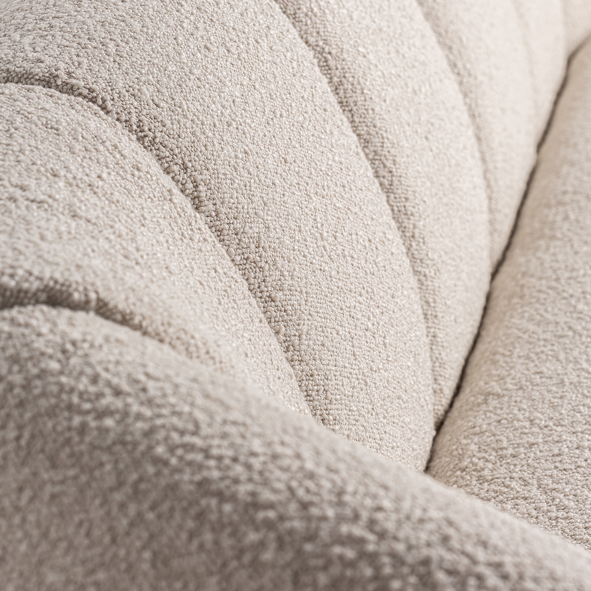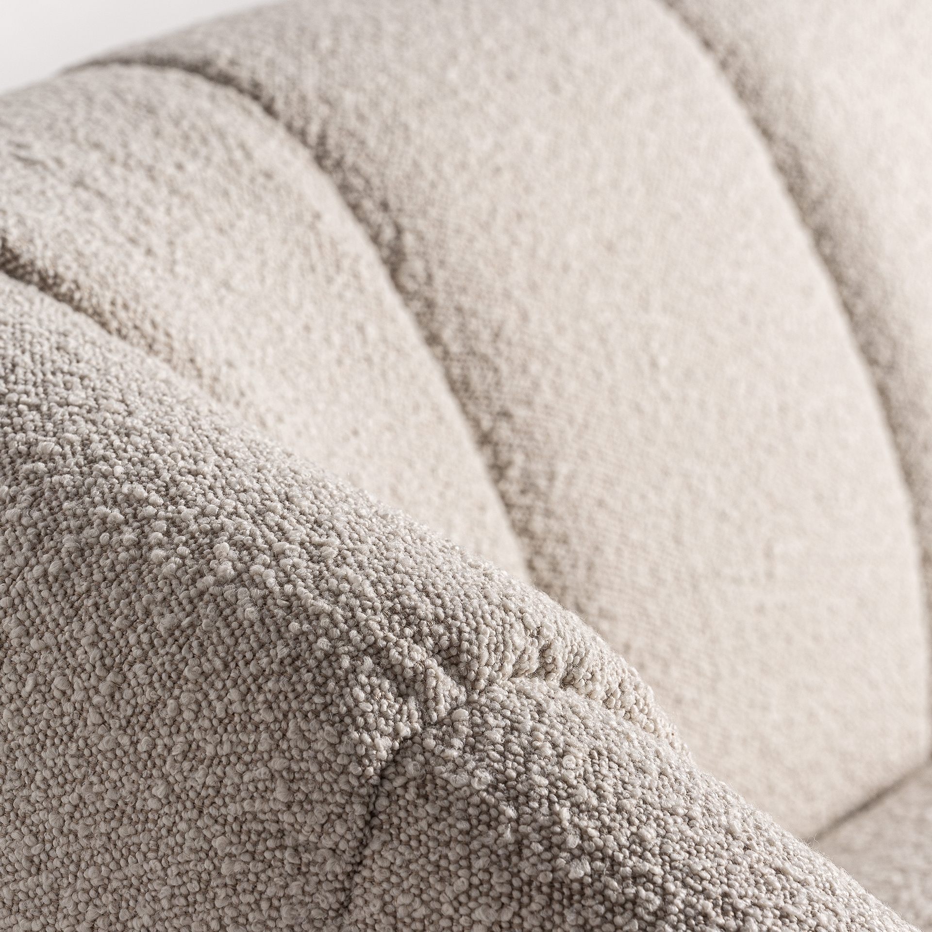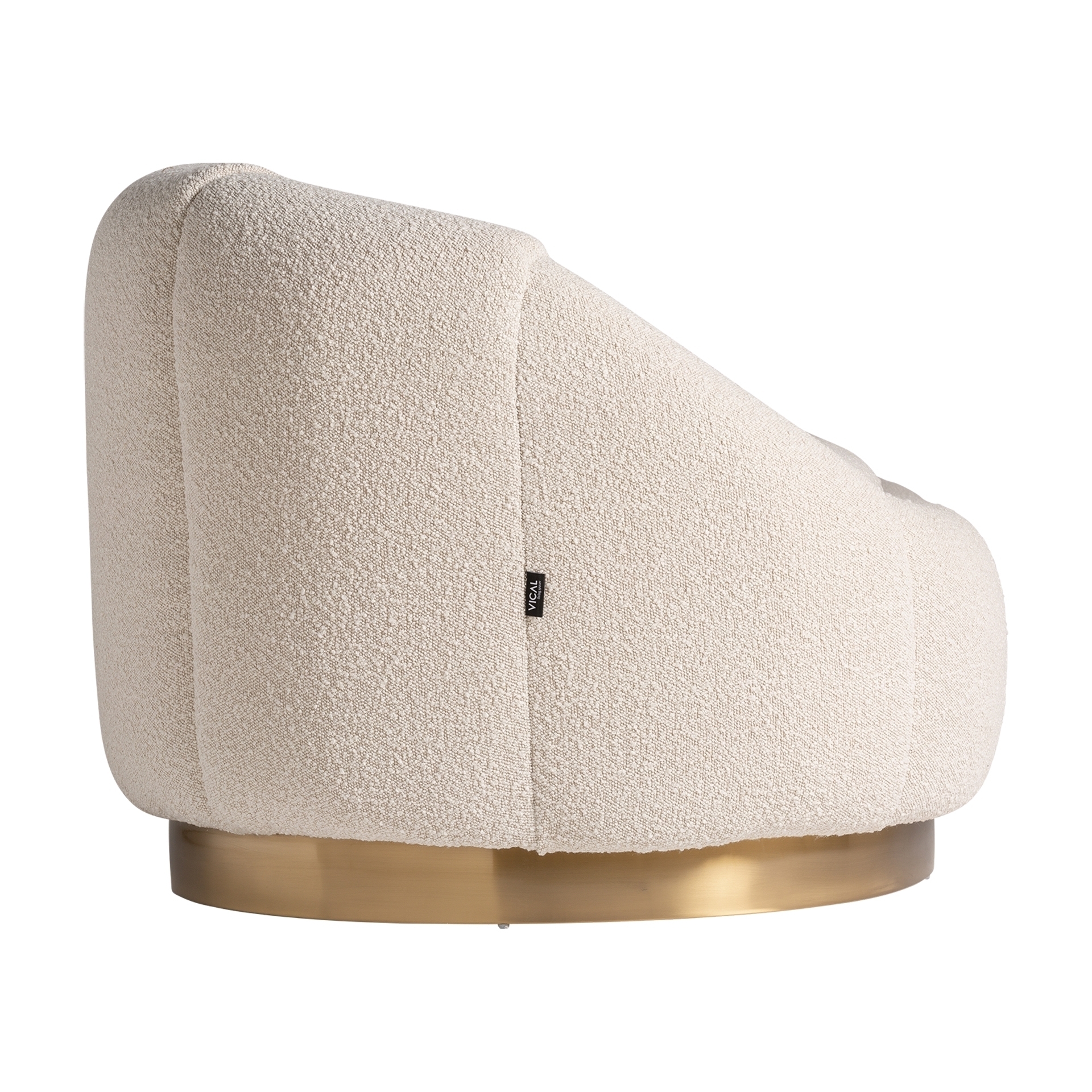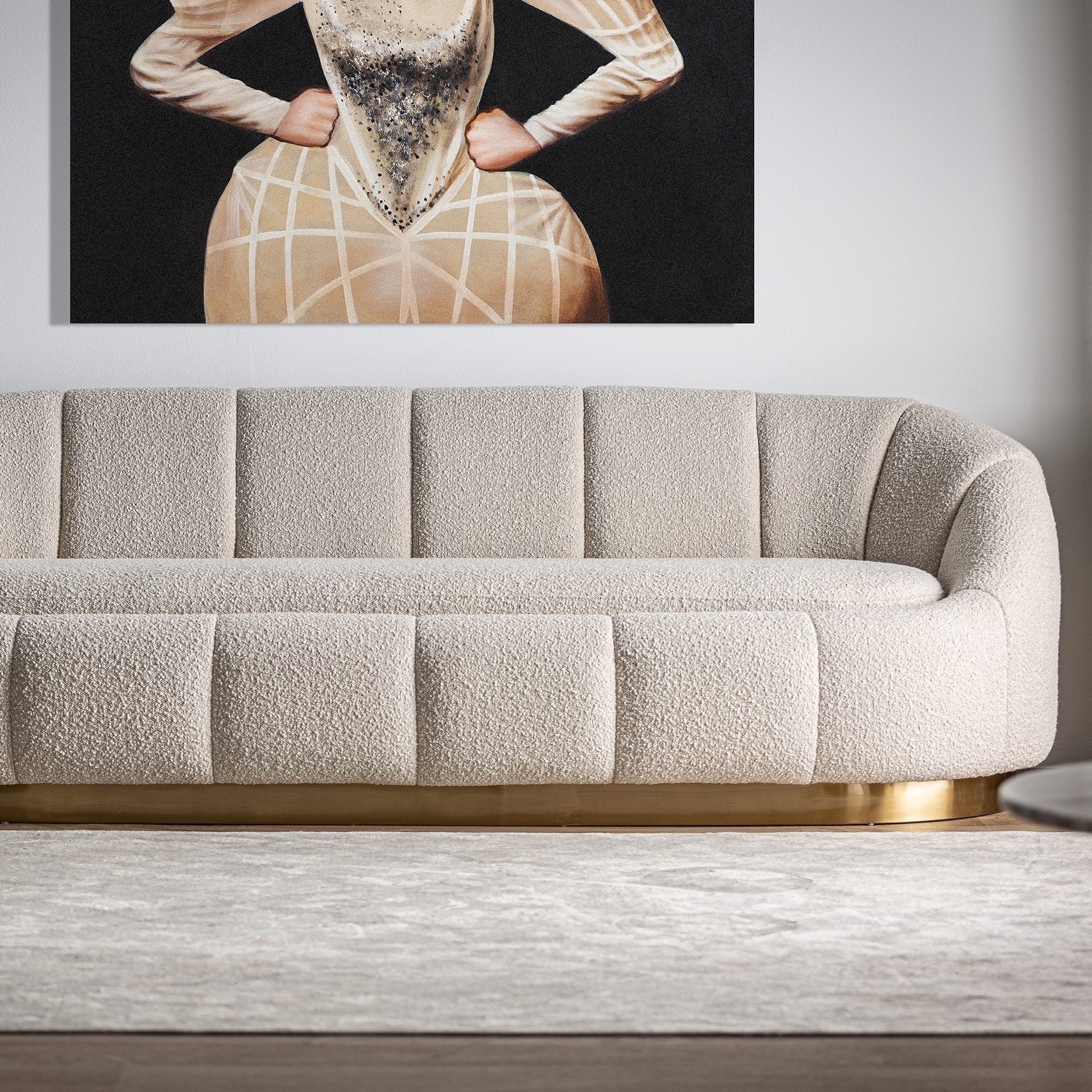 Диван Thyez-букле, бело-золотой, стиль ар-деко. Изготовлен из древесины сосны в сочетании со сталью.