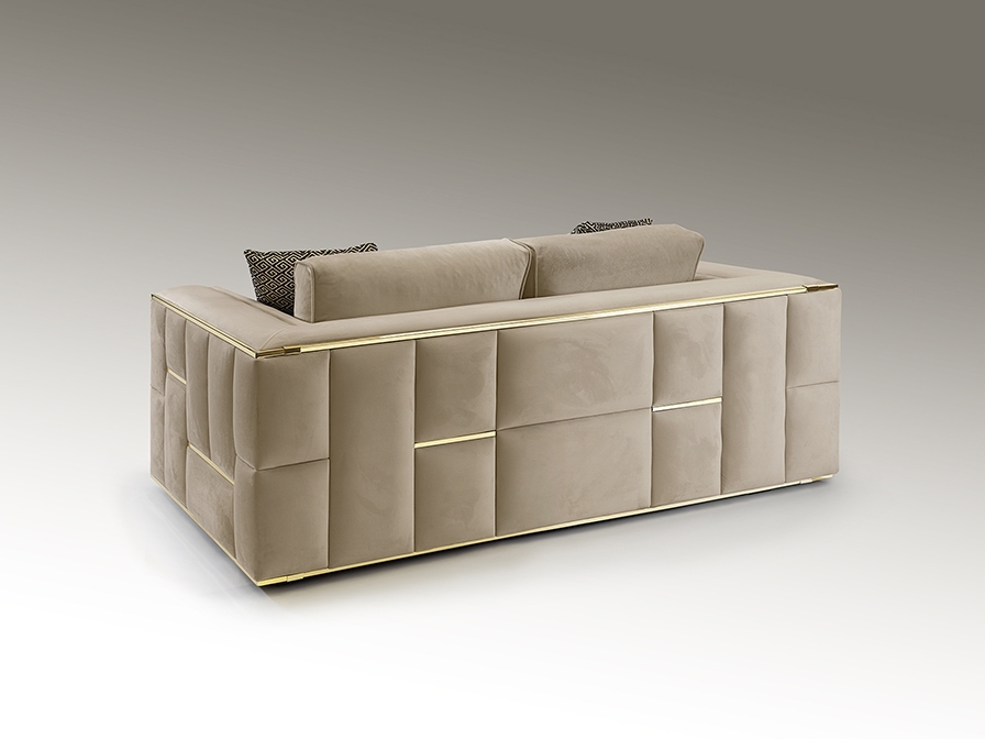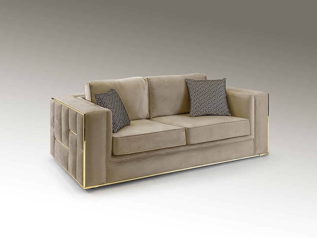 2-местный диван, обитый бежевым бархатом, комбинированные подушки. Декоративные тарелки с золотой отделкой. Ткань 100% полиэстер плотностью 320 гр/м². Структура древесины бука. Наполнен поролоном плотностью 36 кг/м³ и полым волокном.