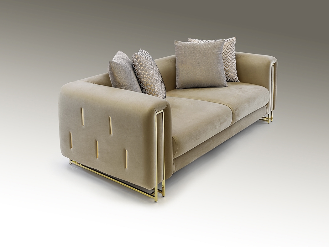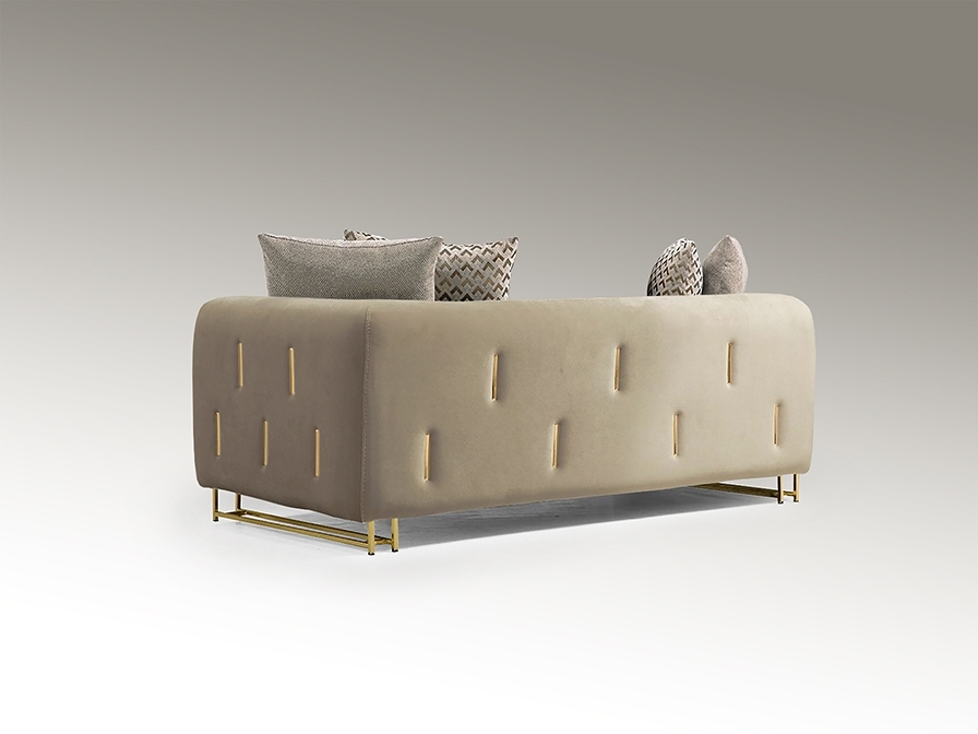 2-местный диван, обитый бежевым бархатом, подушки в тон. Металлические ножки и декоративные пластины с золотистой отделкой. Ткань 100% полиэстер плотностью 320 гр/м². Каркас из бука. Наполнен поролоном плотностью 36 кг/м³ и полым волокном.
